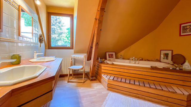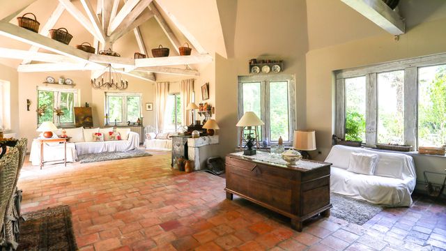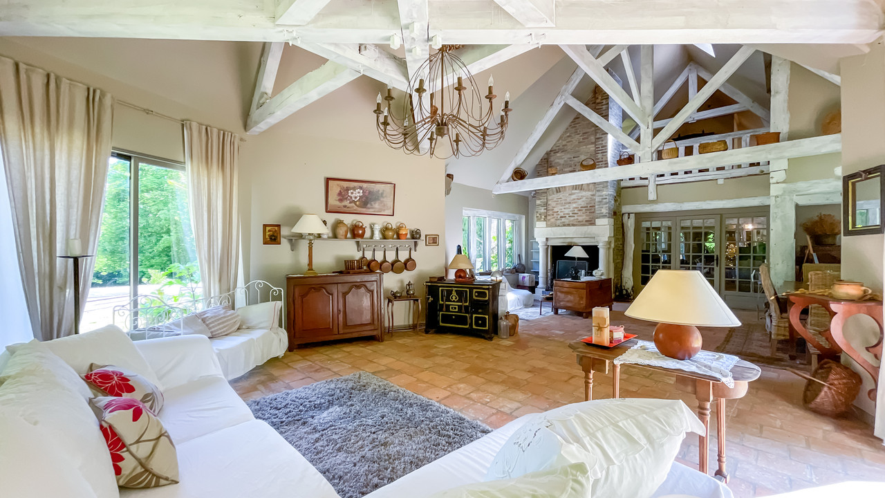 The house features a huge double living room and dining room with fireplaces, 4 bedrooms, 3 bathrooms, and outdoor terraces that optimise the wonderful garden.