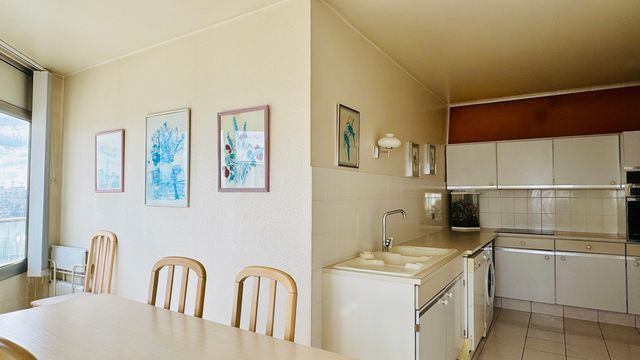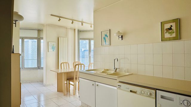 A40567AAD75 - PARIS 13th – Maison Blanche/Place d'Italie – 3-room apt (2 beds) – Energy rating: E/E – 94 m² (see floor plan & virtual tour). On the 18th fl of the Tour Super Italie, at the foot of Maison Blanche M° station (L7 & L14) and 800m from Place d'Italie, with quick access to Orly Airport, this lovely dual-aspect apt of 94.40 m² Carrez (94.0 m² total floor area) offers unobstructed panoramic views. Bathed in light thanks to its N/E double exposure, it stands out for its warm atmosphere and floating wood floors throughout. The layout includes an entrance with built-in closets, a bright 21 m² living room, an equipped separate kitchen with dining area, 2 bedrooms, a shower room, a closet, and a separate WC. Located in a prestigious and secure residence (256 apartments) with caretakers and CCTV, the bldg offers rare amenities such as a private indoor swimming pool and a panoramic solarium on the 34th fl, close to shops and public transport. A cellar is included. Parking available at extra cost.