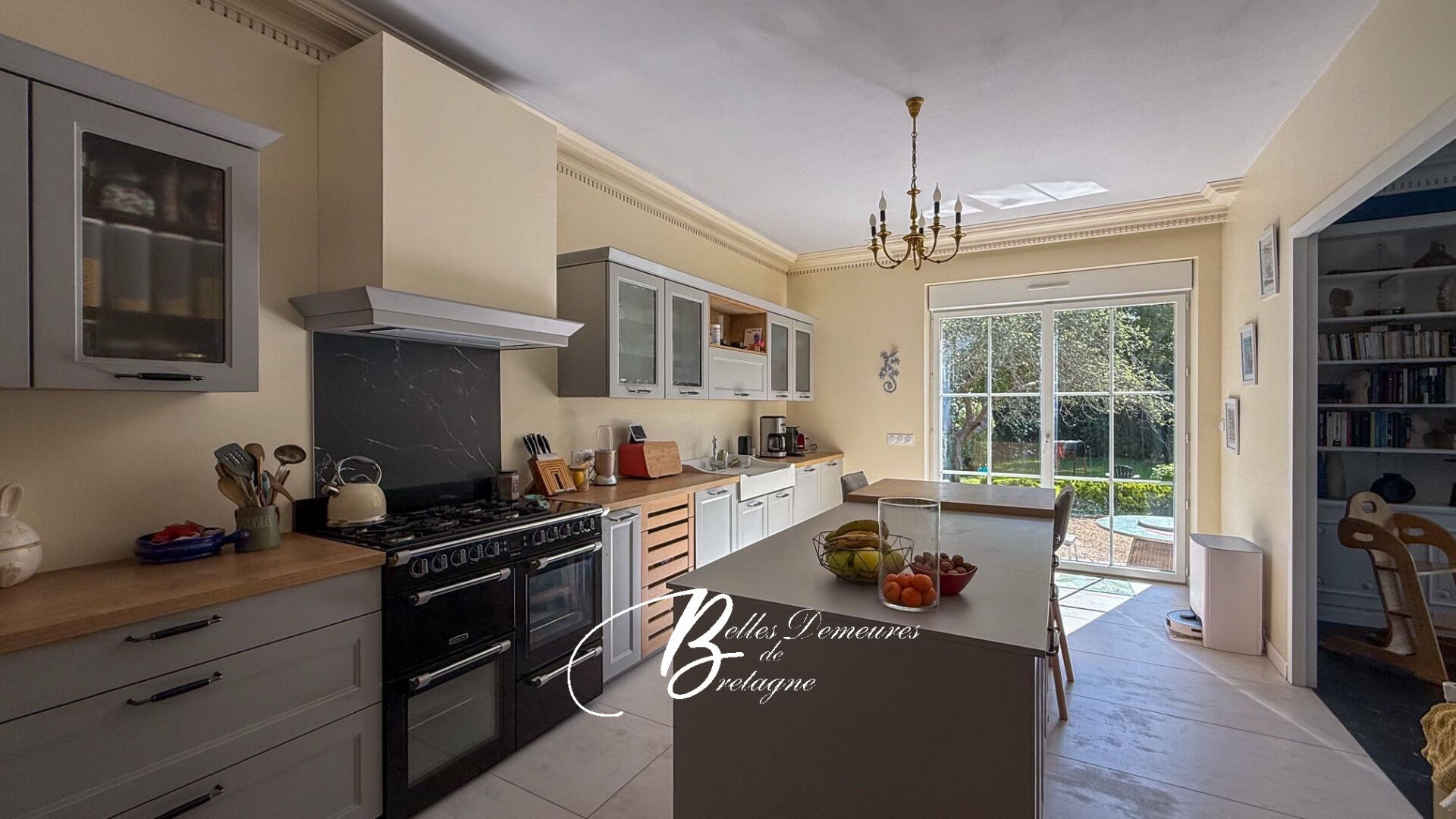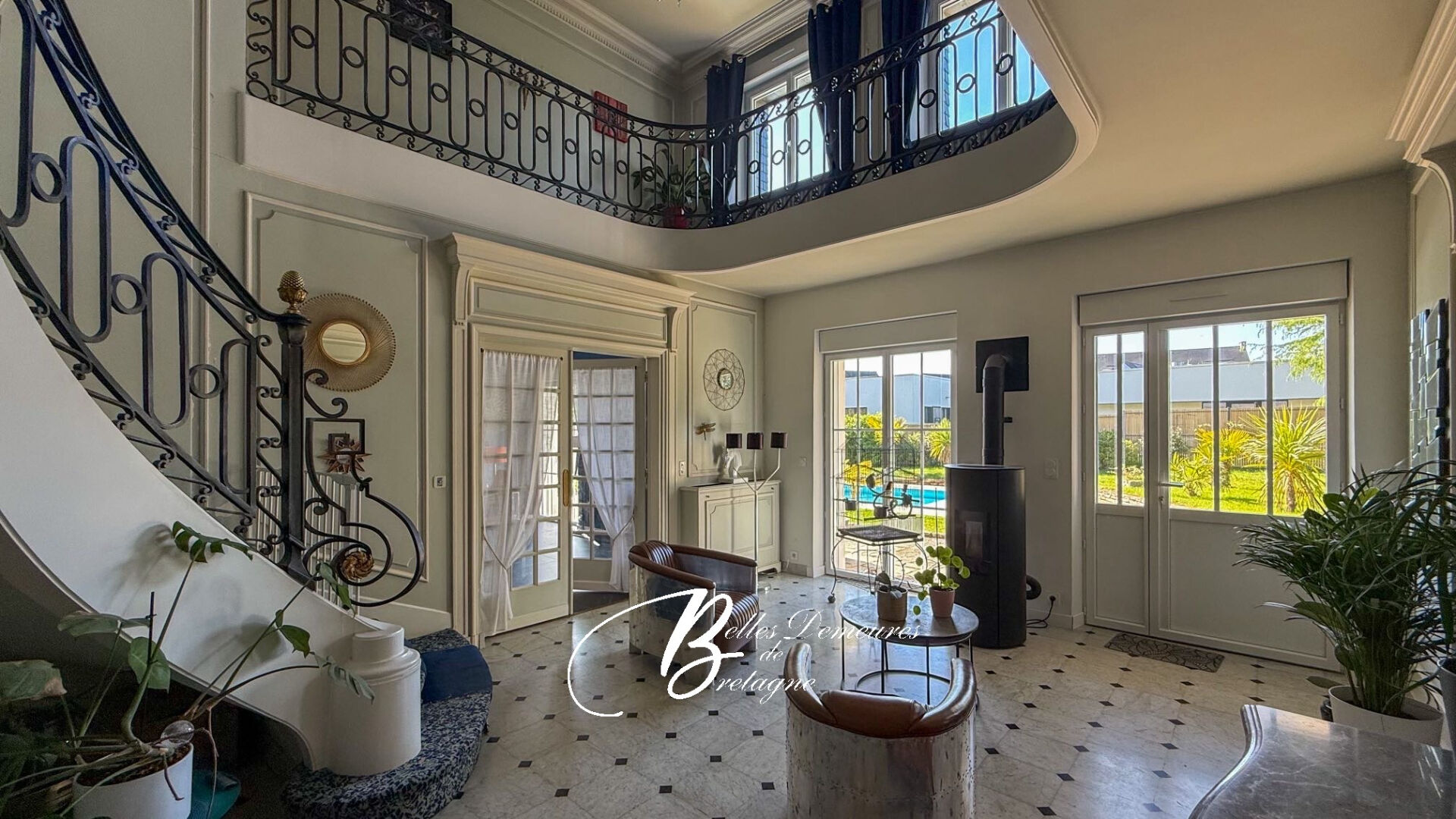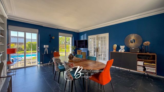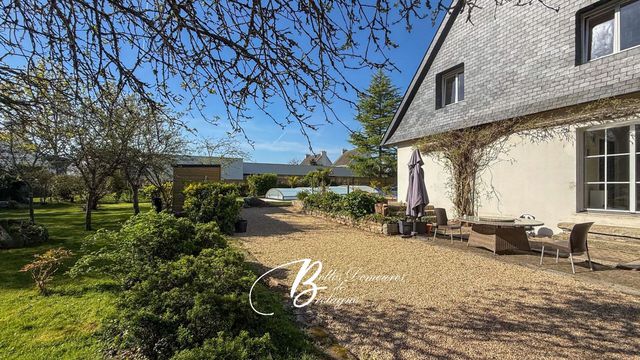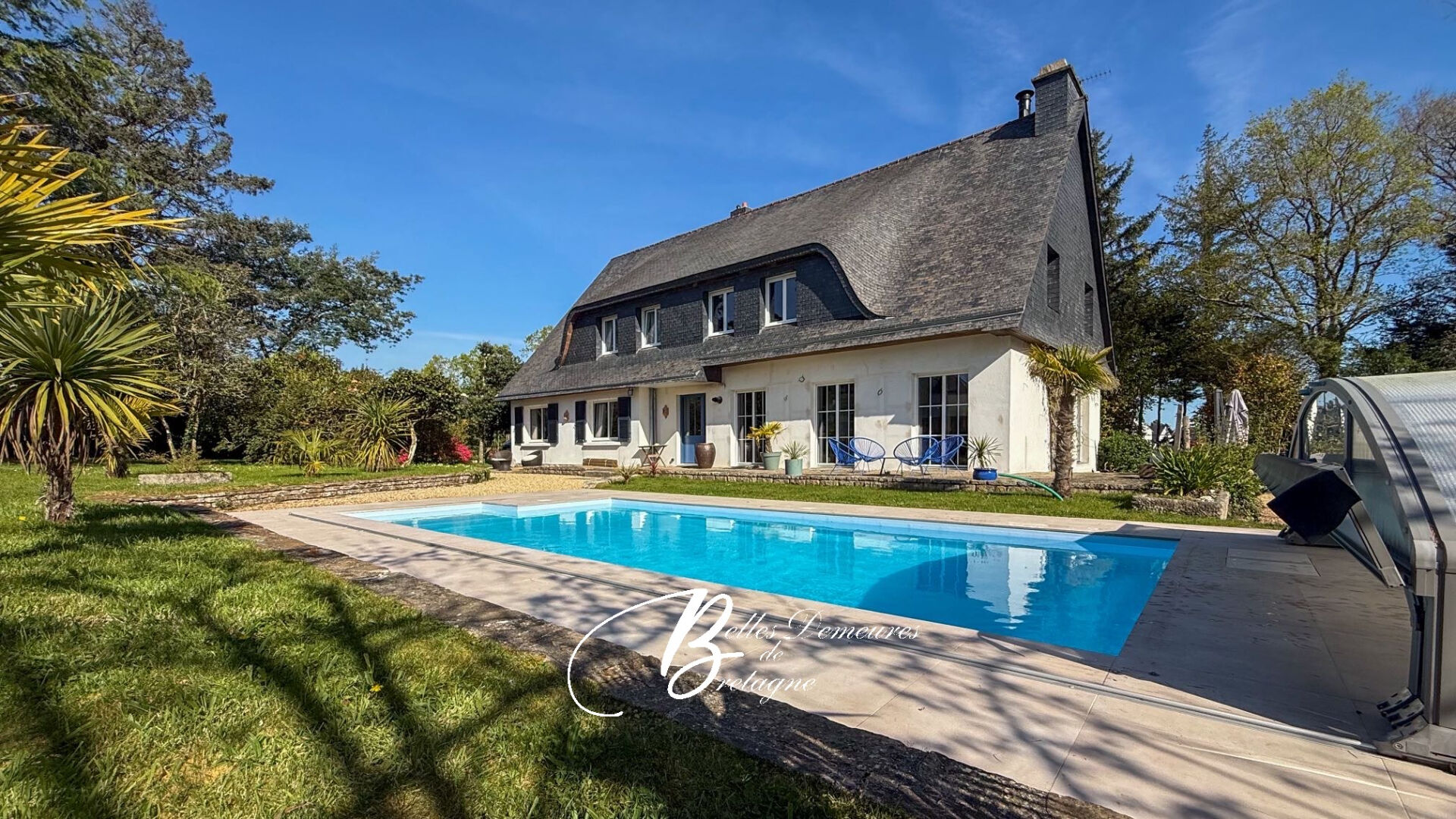 À seulement 5 kilomètres de Pont-Aven, la célèbre cité des peintres, et au coeur du village recherché de Riec-sur-Bélon, cette majestueuse demeure familiale de 335 m², édifiée en 1969 et rénovée, offre un cadre de vie exceptionnel sur un parc arboré et constructible de 5 000 m², à l'abri des regards.