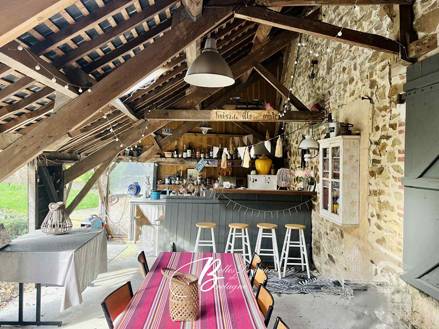 À l'extérieur, une belle dépendance en pierre comprend plusieurs garages et se prolonge par un charmant appentis aménagé en cuisine d'été ouverte sur le jardin clos.