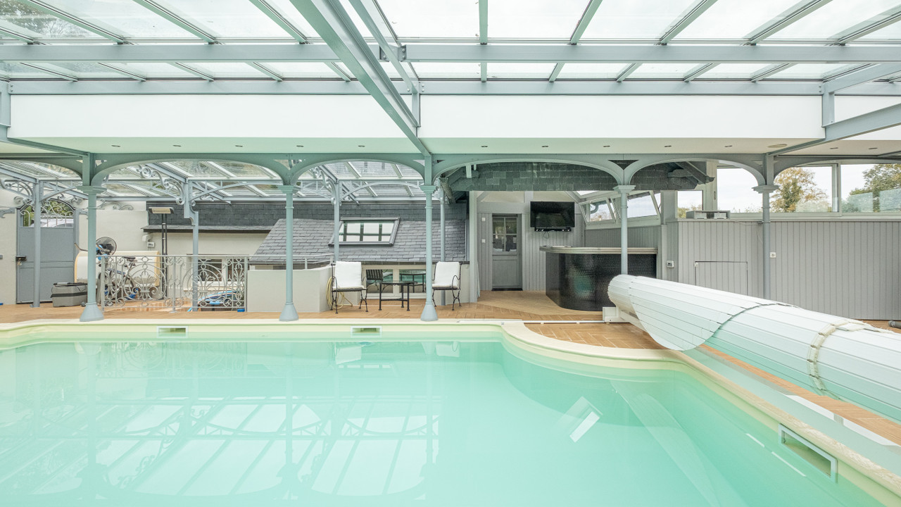 This beautifully renovated 402 m² home on 3,200 m² of landscaped grounds offers 5 bedrooms, spacious reception areas, and an indoor glass-roofed pool. A 60 m² independent guest house provides rental potential or private accommodation for visitors.