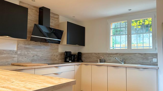 The bright and spacious living room with fireplace opens through large sliding doors onto the terrace, offering stunning panoramic views of the surrounding hills and mountains. The open-plan fully equipped kitchen with dining area creates a welcoming living space.