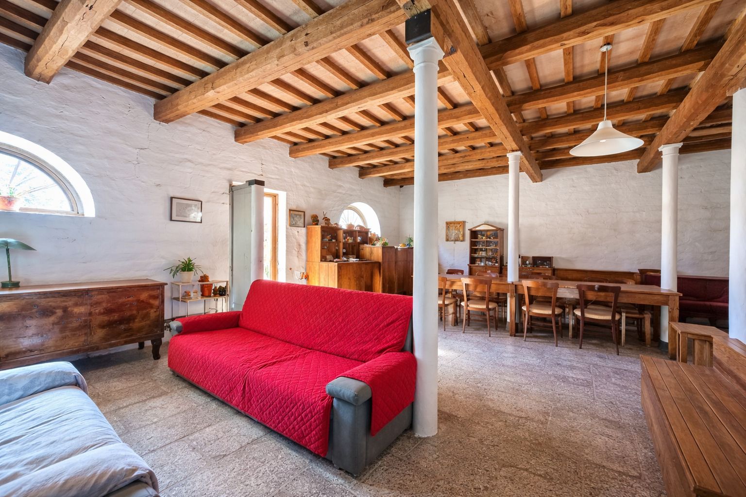 An beiden Seiten des Hauses befinden sich große Scheunen, die vielfältige Nutzungsmöglichkeiten bieten. Eine davon lässt sich beispielsweise in eine stilvolle überdachte Außenfläche mit Pizzaofen verwandeln, während die andere ideal als Lagerraum oder für weitere Ausbaumöglichkeiten genutzt werden kann.