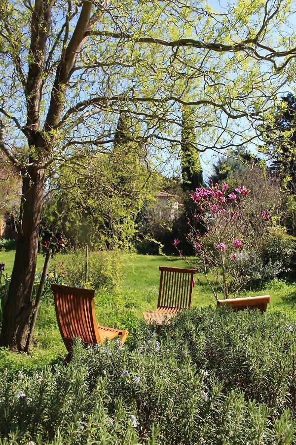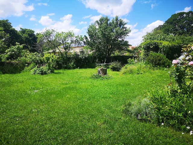 Großer, mit steingezäunter Garten mit herrlichen Blumen, ruhige Lage inmitten der Natur im malerischen Dorf La Bruguière, nur 10 Minuten von der historischen Stadt Uzès und 45 Minuten vom TGV-Bahnhof Avignon entfernt.