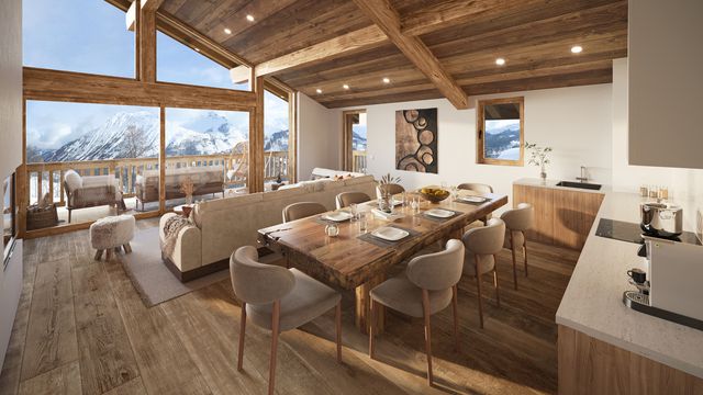 A43270EH73 - This elegant 4-bedroom penthouse apartment is located in the charming alpine village of Saint-Martin-de-Belleville, within an exclusive new build chalet-style residence just 250 metres from the ski lifts of the 3 Vallées. The property features four double bedrooms, including one set on a characterful mezzanine level, as well as a bright open-plan living and dining space designed for comfortable mountain living.