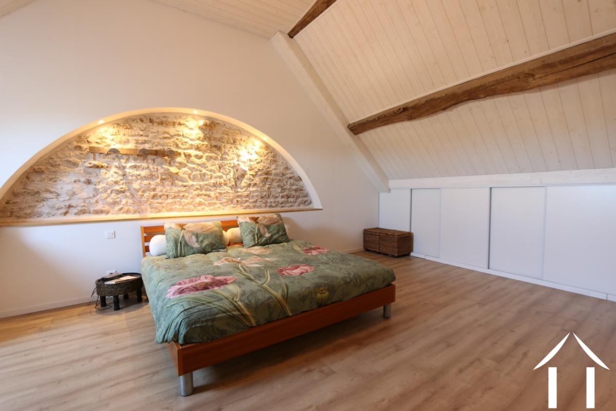 The staircase leads us to a landing that opens onto two bright south-facing bedrooms, each with its own stone "niche" and a view of the village church, as well as a bathroom and toilets, and a third bedroom located at the back, a few steps lower, which can serve as a TV room, office, and/or guest bedroom.