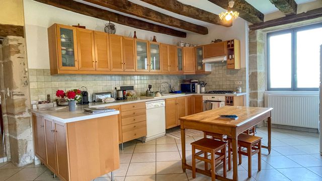 A36913NB46 - Nestled on the heights of a village with shops and services, this vast property will immediately seduce you with its charm: a large stone Quercy house with exposed beams, bolet, souillarde, bread oven... its barn with courtyard and terrace overlooking the pool with panoramic views of the Quercy hills.