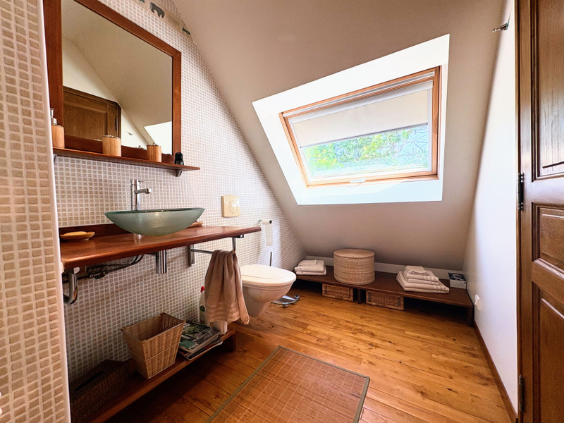 Upstairs, a spacious mezzanine area (23m²) currently serves as an office or relaxation space, featuring triangular Velux windows with garden views. This floor also includes a bright double bedroom (16.5m²) and a modern bathroom (5m²) with WC, heated towel rail, and built-in storage.