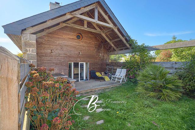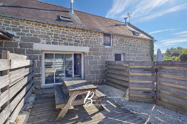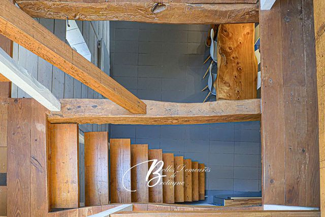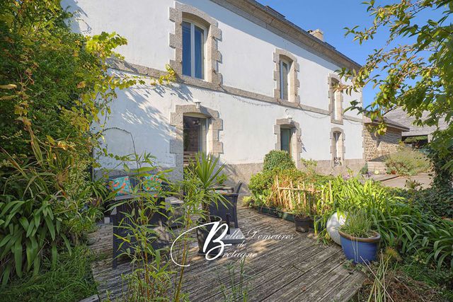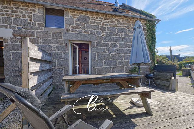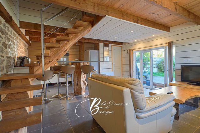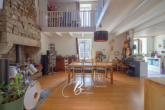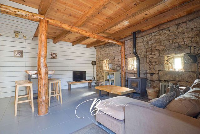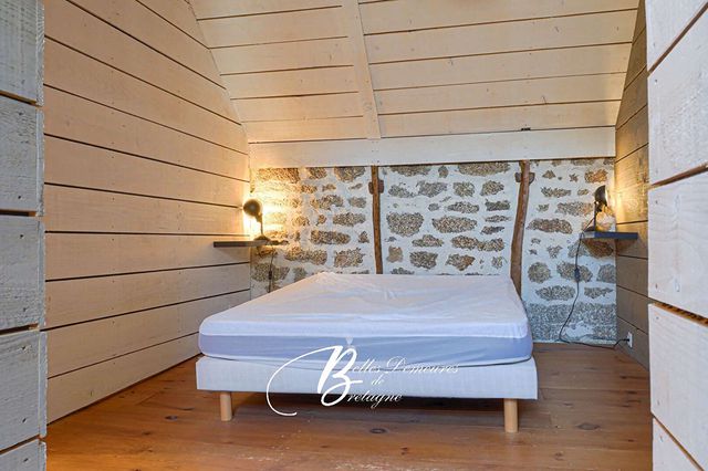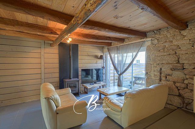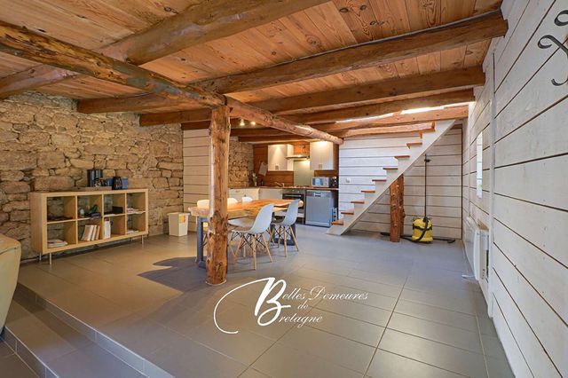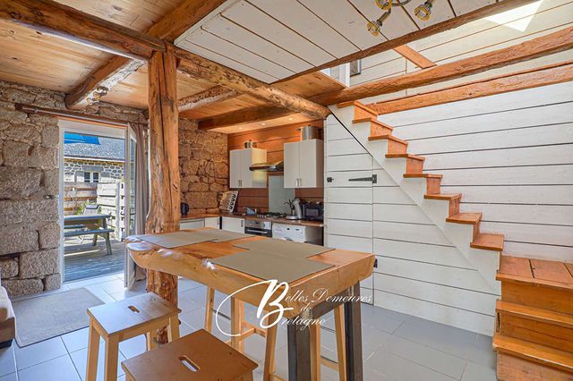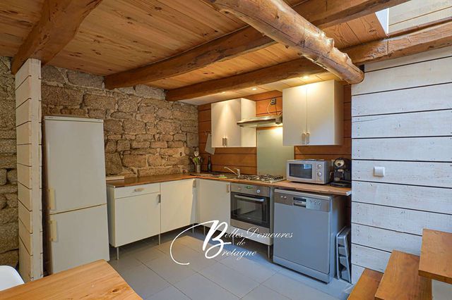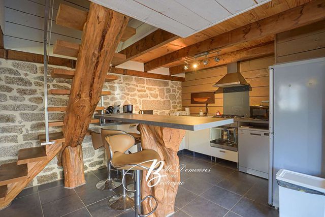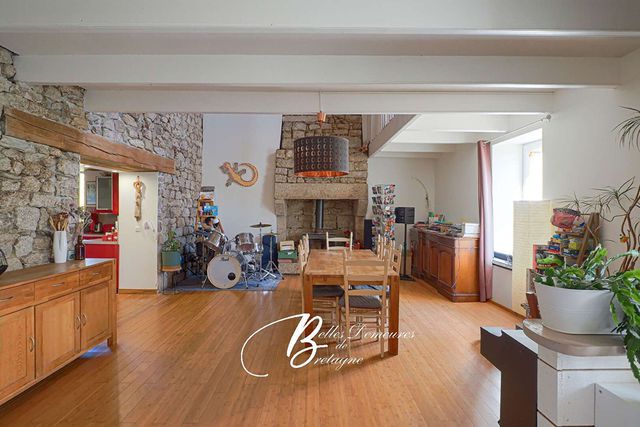 This stone residence retains all the charm of Breton buildings, with its exposed beams and its old cider press preserved in the kitchen. - Ground floor: large, inviting kitchen opening onto a terrace, spacious 70 m² living room, one bedroom, shower room, WC, and utility room.