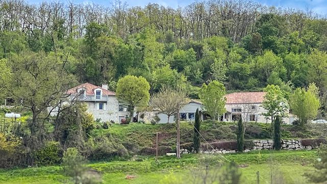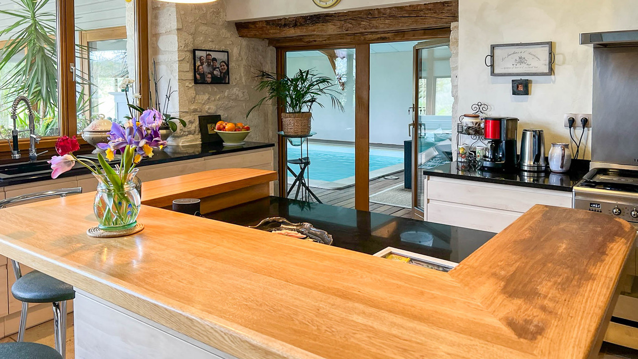 The main farmhouse has been redesigned and now houses 2 completely private gites (3 bedrooms and 2 bedrooms) on different (all ground floor) levels. The former barn has been completely restored and is now the main residence with 4 bedrooms (all with en suite bathrooms) and an indoor swimming pool. There are some small outbuildings with a garage and a workshop. The solar panels covering the roof on the outbuilding help to reduce the electricity bill significantly.