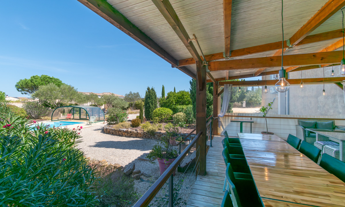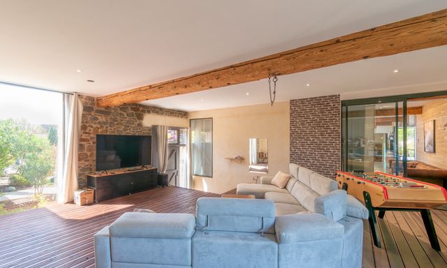 A38780JAV11 - In the heart of the Corbières wine region, this exceptional early 1900s domaine blends character and modern comfort. Fully renovated, it offers 580 m² including a spectacular 90 m² cathedral-style living room with open Italian kitchen, 6 elegant en-suite bedrooms, and two independent gîtes with private terraces. Comfort is assured with floor heating, full air conditioning, ground-source heat pump, solar panels, and excellent energy ratings. On 2,530 m² of landscaped Mediterranean gardens, enjoy a covered terrace, pool with cover, pétanque court, and shaded seating areas. A vast 253 m² garage and parking for 10 cars complete the property.