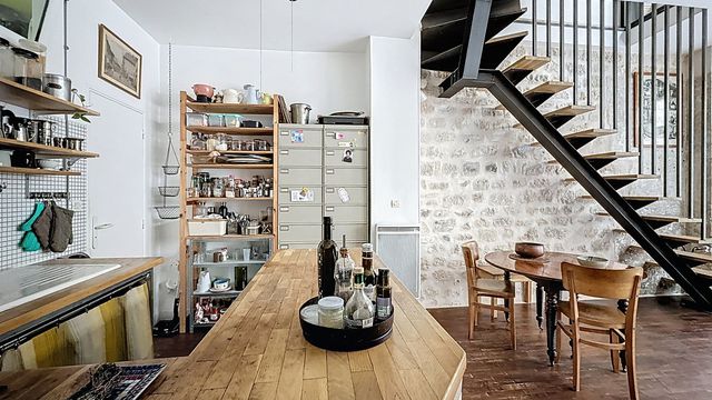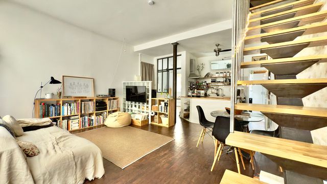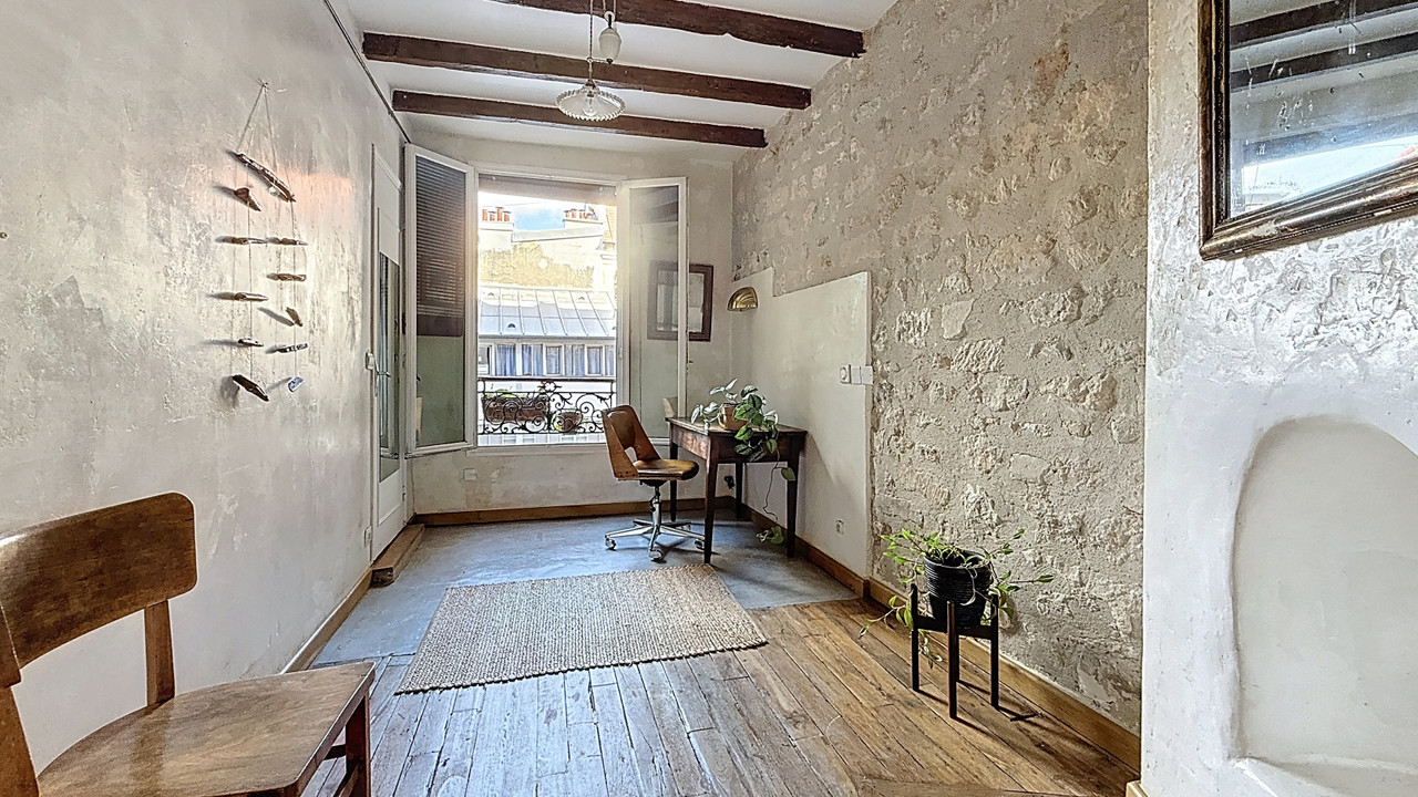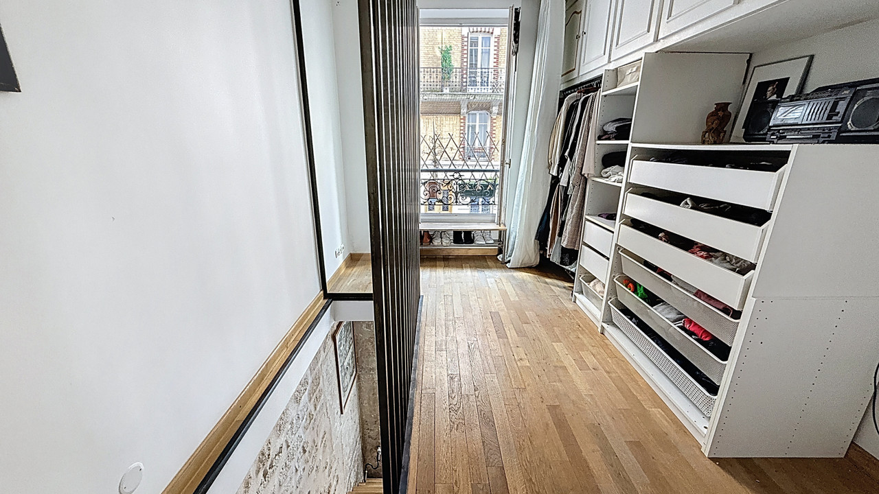 A42088LUM75 - LAMARCK-CAULAINCOURT METRO – Montmartre, atypical duplex apartment of 74.2 m² in a well-maintained period building, converted from a former shop into an artist's studio. Bright, quiet, and spacious, it features high ceilings, exposed beams and stone walls, cast-iron columns, and authentic Parisian charm. Access via the main building (raised ground floor), directly from the street for easy entry, or from the upper level. The raised ground floor includes a garden-facing bedroom, functional open-plan kitchen with bright living area, bathroom with WC, and laundry. Upstairs: garden-facing bedroom with large adjoining dressing room leading to shared areas, Italian-style shower room with WC, and an office or guest space with open views. Private cellar. A unique blend of light, calm, and character in the heart of Montmartre, close to shops, restaurants, and transport.