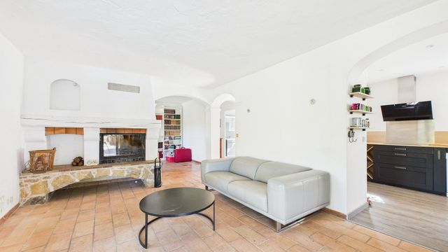 The main villa features a bright living dining room with insert fireplace, dining area, veranda, and a fitted open plan kitchen, while the guest house provides two bedrooms with private bathing facilities, ideal for hosting family and friends or creating an independent professional space. Outside, generous terraces surround the pool and gardens, offering a relaxed Mediterranean lifestyle only minutes from local amenities and within easy reach of the coast and airport.