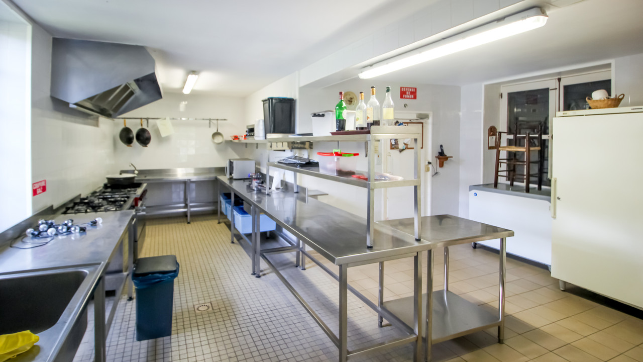 A fully equipped professional kitchen with storage ensures smooth operations.