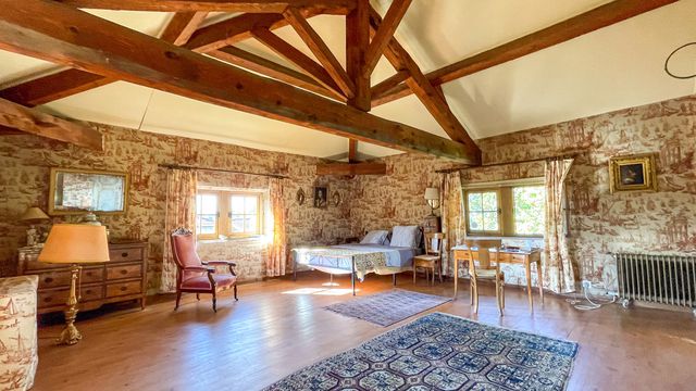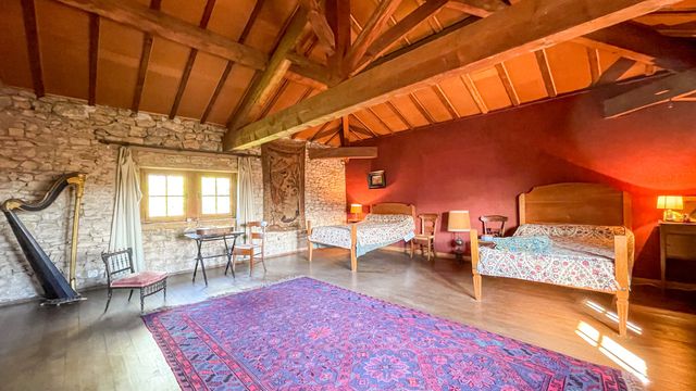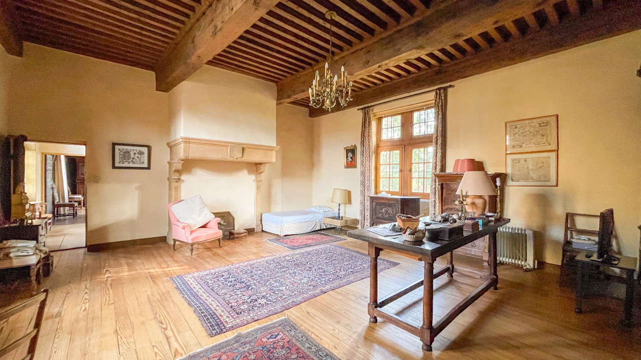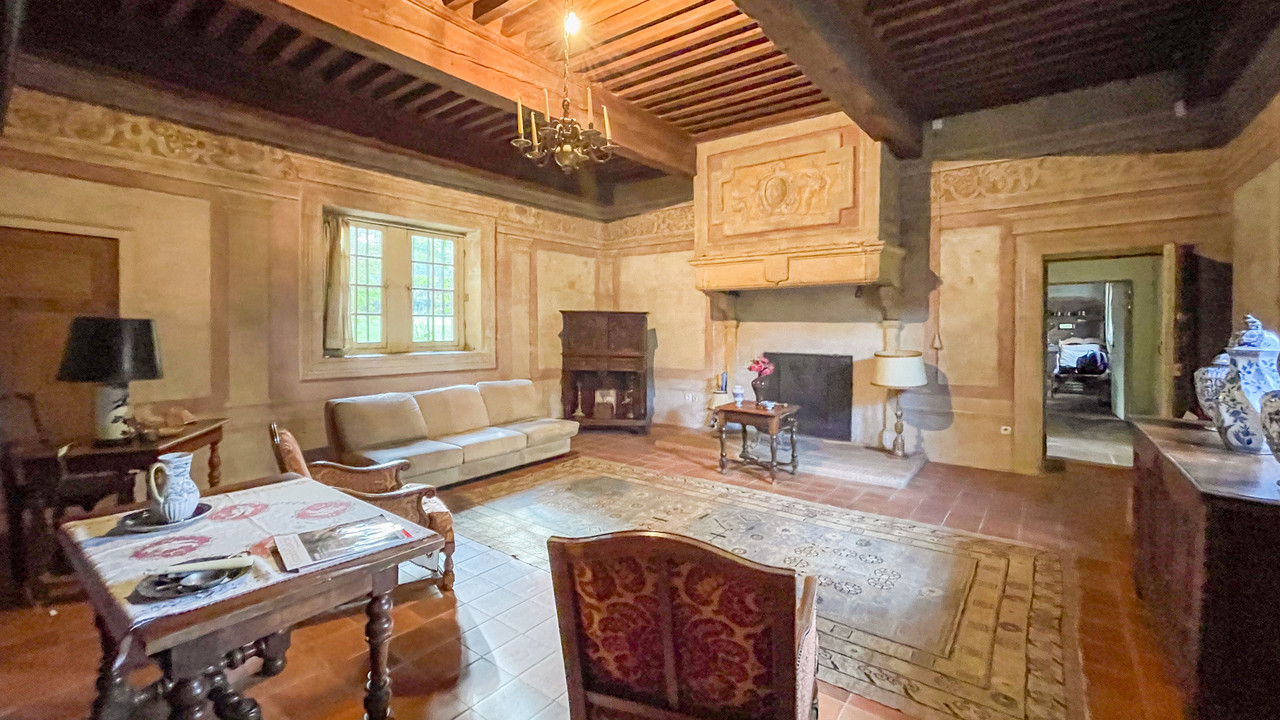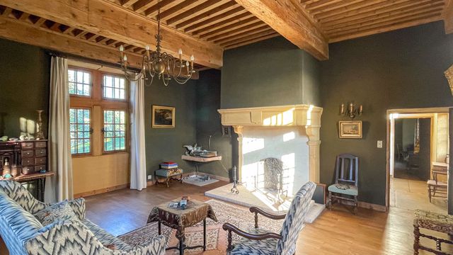 Ground floor: Living room 41m with a tiled floor and with access to a cellar with vaulted ceiling. The room features a magnificent golden limestone fireplace and trompe l'œil murals.