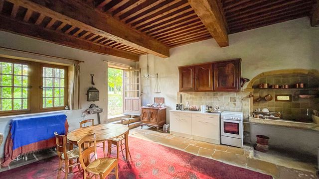 Kitchen and dining room 41m2 with original golden limestone floor, magnificent fireplace and the original golden limestone sink.