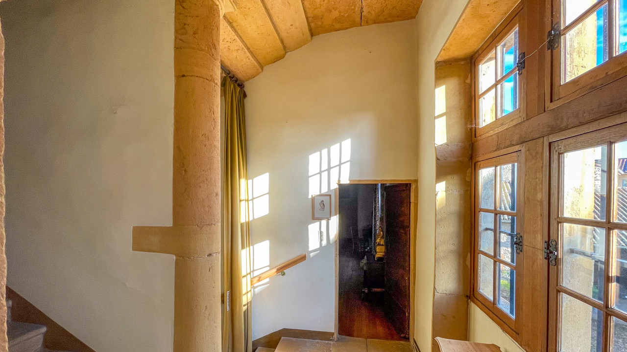 Entrance through the original door into a hallway with original floor and wall end column with concentric capital, column base and arch all beautifully carved out of golden limestone.