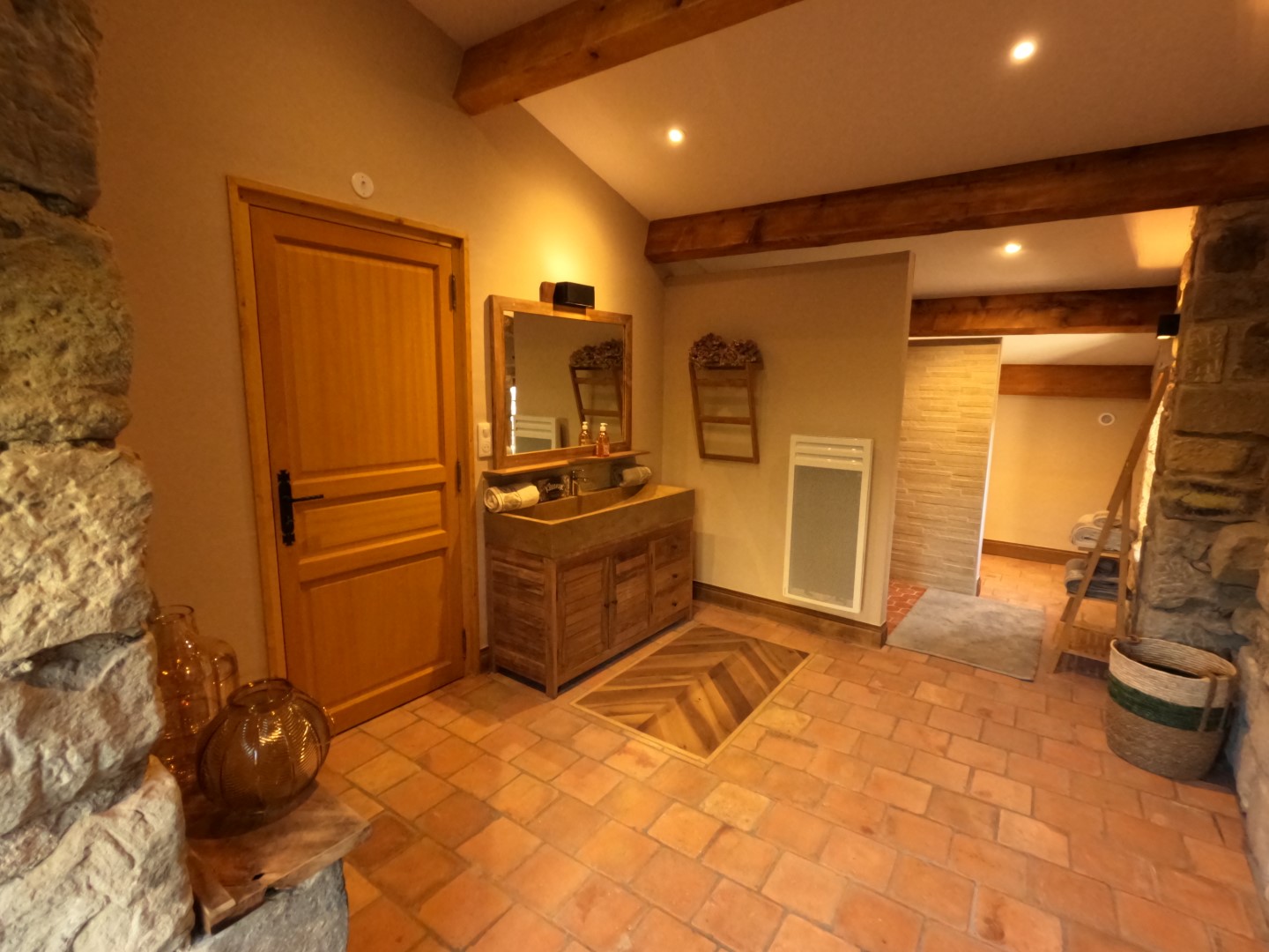 The interior comprises an entrance hall, a fitted and equipped kitchen with a beautiful, high-performance wood-burning stove ready to cook up delicious meals, a dining room known as the 'Salle des Chevaliers', a beautiful private lounge with a stone fireplace, a storeroom and boiler room, and three bedrooms upstairs that can be converted into private rooms with a bathroom. This part of the house can be used to provide additional guest rooms, ideal for continuing a tourist activity or welcoming family and friends in complete independence.