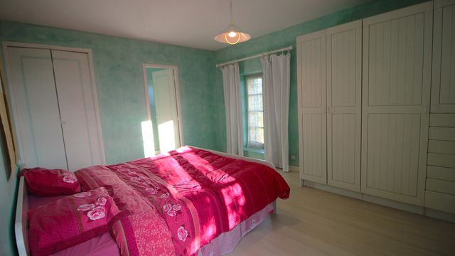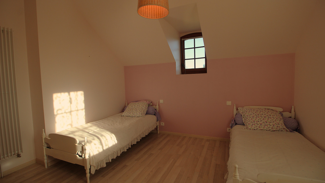 The conversion provides a large living area and two en suite bedrooms. There is still a large attic to be converted if desired, as well as a large two-car garage, a workshop, and space for wood storage.