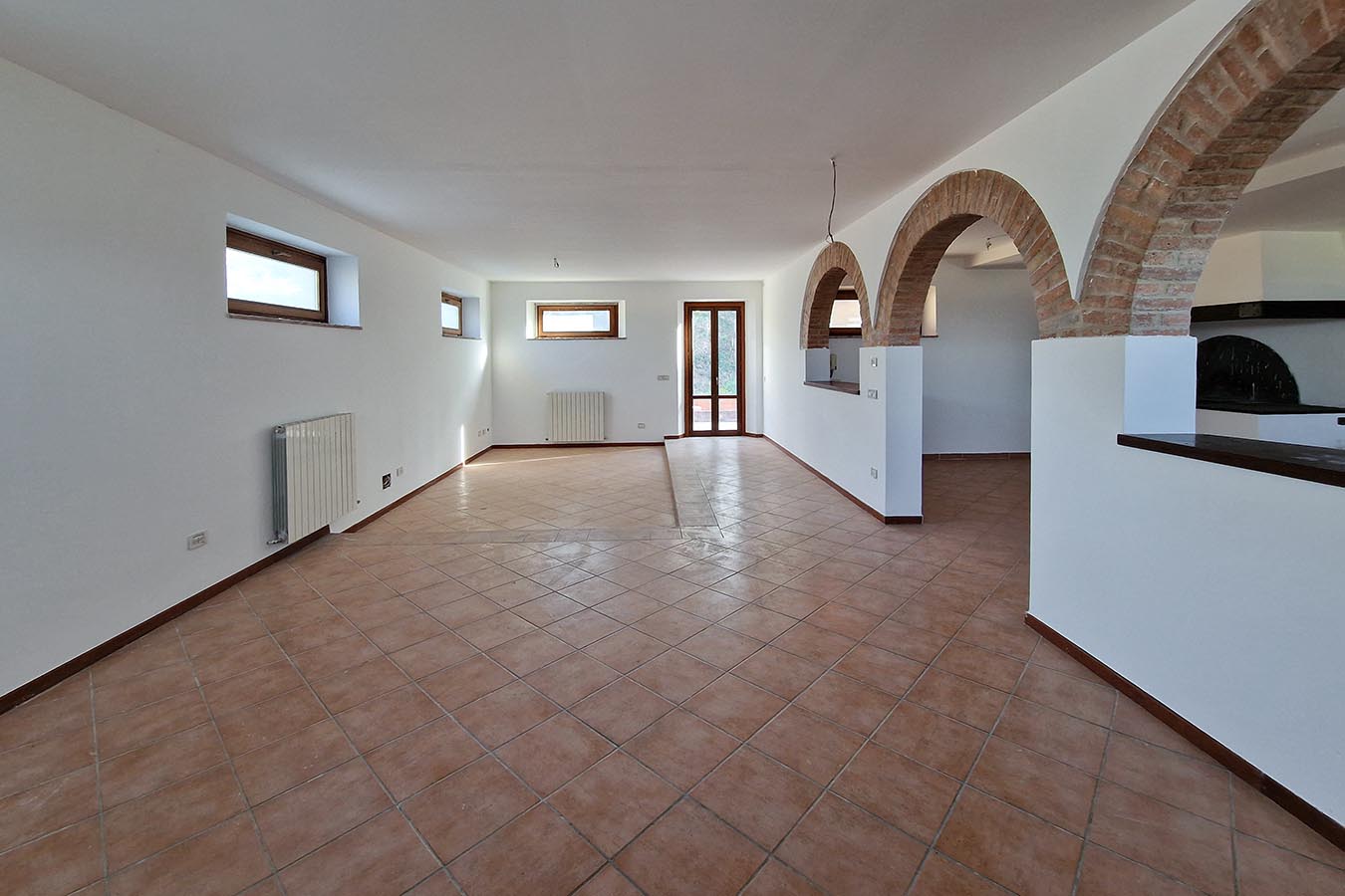 The ground floor of the farmhouse of about 165 sqm is divided into a wide living room with fireplace barbecue area, a kitchen, a pantry, a double bedroom and a bathroom, an internal staircase leads to the first floor, of about 165 sqm which is accessible also from the external stairs typical of the Marche farmhouses, which is divided into an additional living area with fire place, four double bedrooms and two wide bathrooms. All bedrooms are extremely generous in size, as are the living rooms on both floors and the bathrooms on the first floor.