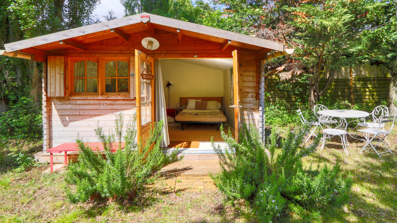 It features a bright, modern living room with open kitchen, one bathroom, one shower room, three bedrooms, a separate WC, utility room, and a garage. Bonus: an independent, insulated and electrified chalet – ideal as a home office or fourth bedroom!
