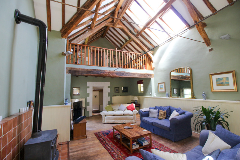 To the right is a snug (22m2) with wood burner and cupboard under the stairs and a door to the outside terrace. Off this room is a bathroom (5m2) with bath, basin and WC and bedroom (21m2) with cupboard and door to the outside terrace. To the left of the kitchen is a double height living room (42m2) with wood burner. A mezzanine sits above part of this room. Continuing through, there is an office (11m2) with cupboard under the stairs, a hall and utility room (12m2) with door to the courtyard and a shower room (4m2) with shower, basin and WC. From the hall, there is another room (32m2) currently used as a gym with doors to the rear garden and access to a storage room (15m2) with door connecting to the barn attached.