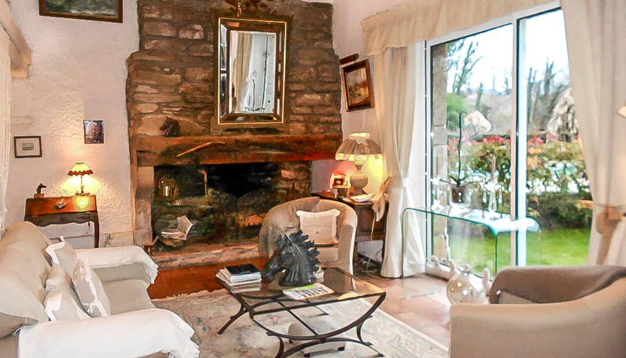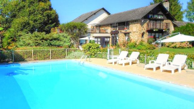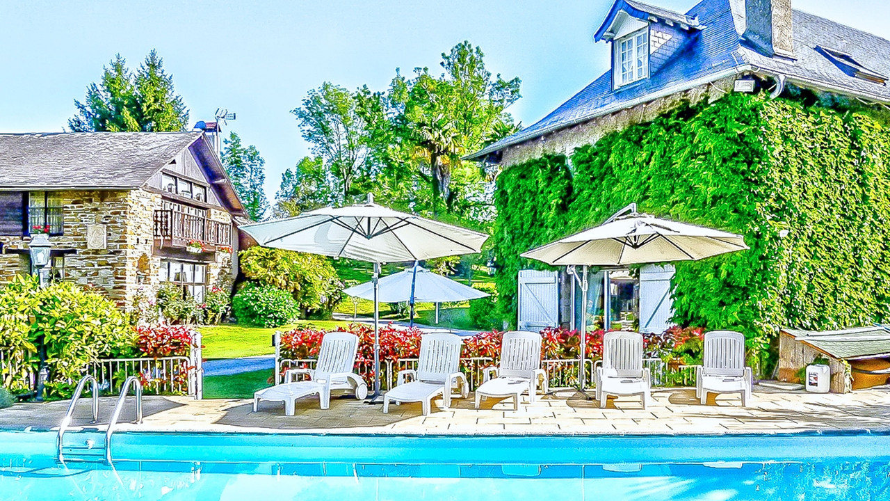 A19027CEL64 - Nestling in a magical hilltop setting in the beautiful Béarnaise countryside, this elegant country estate of 27 hectares has fabulous views of the Pyrénées, two exquisite farmhouses, a luxurious converted barn ideal for holiday rental with eight bedrooms, sauna and gym, three chalets on long-term furnished leases, stables for horses and a delightful swimming pool (14m x 7m) surrounded by a sun terrace.