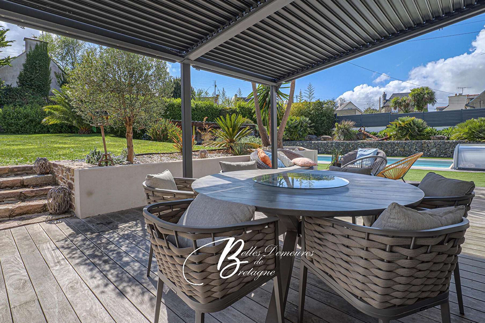 Implantée sur un vaste terrain, la propriété bénéficie d'aménagements extérieurs soignés: plusieurs terrasses dédiées à la détente et aux repas, espaces paysagers, ainsi qu'une piscine chauffée avec pool house. Un ensemble pensé pour profiter pleinement des beaux jours et recevoir en toute élégance.