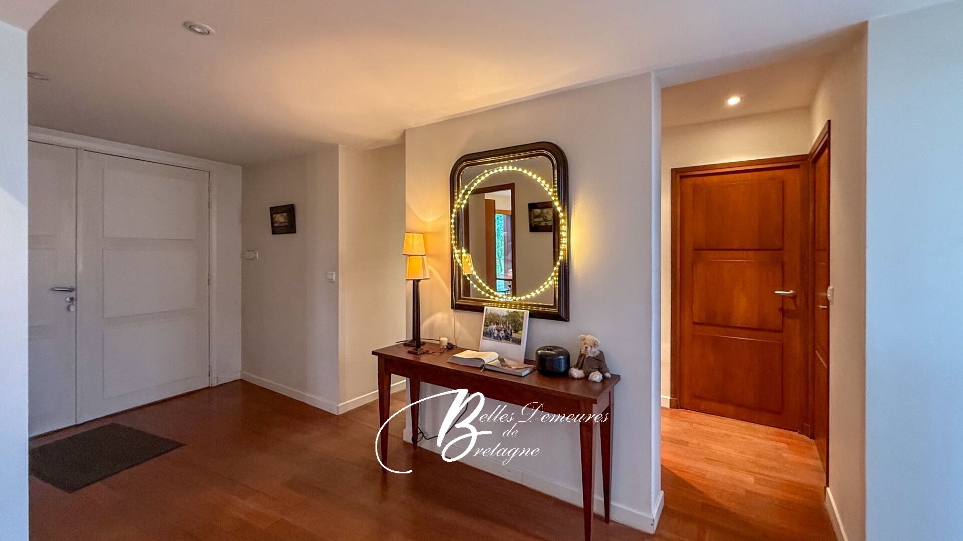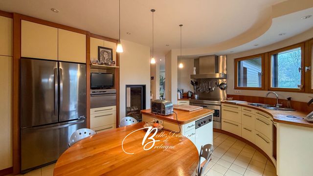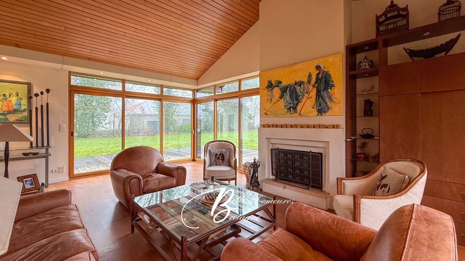 Pensée pour permettre une vie de plain-pied (198 m² en plain-pied), la maison s'ouvre sur une vaste entrée menant à un espace de vie lumineux de plus de 60 m². Le salon-séjour, sublimé par un plafond cathédrale et une cheminée, bénéficie de larges ouvertures donnant accès au jardin et à la terrasse récemment rénovée. La cuisine, élégamment aménagée autour de son îlot central, complète cet espace convivial et fonctionnel.