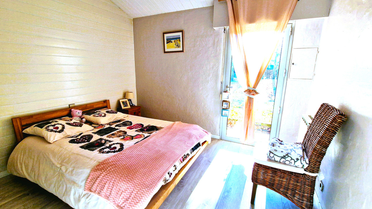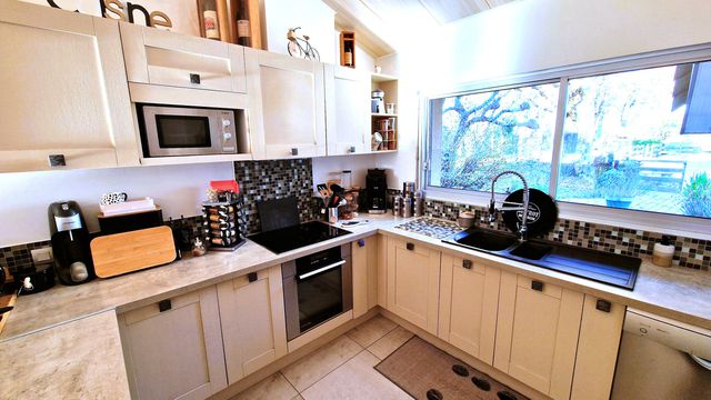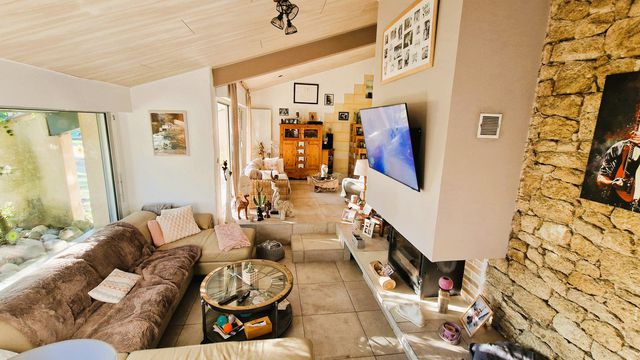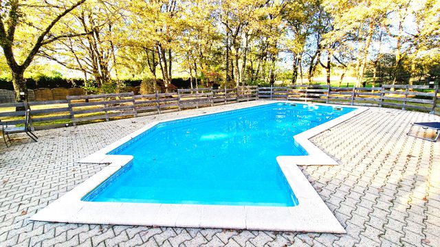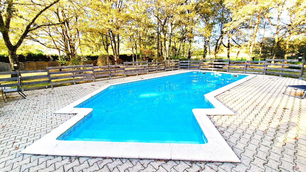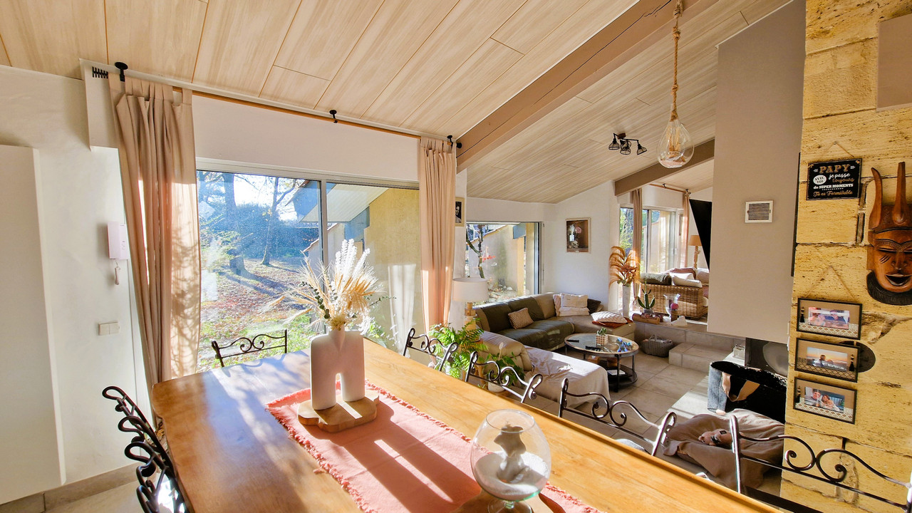 A41376SAG24 - Beautiful architect-designed home in Menesplet, modernised and set in a peaceful, leafy environment with mature trees. This spacious family home offers multiple living areas, a fully equipped kitchen, and a mezzanine perfect for an office or playroom. Outdoors, enjoy a large terrace with covered barbecue, 12×5 m swimming pool, and an independent studio for guests or rental. Modern comforts include new tiling, heat pump, roller shutters, and insulation. Close to amenities, train station, and motorway. Septic tank non-conforming but no other works required. Ideal for family living or investment.