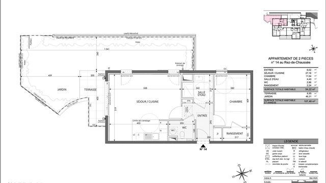 This garden floor apartment has : an entrance hall, living room with an open kitchen opening unto the terrace and garden with South/West exposure, 1 bedroom, a shower room, toilets.