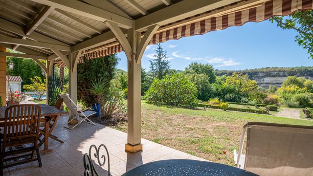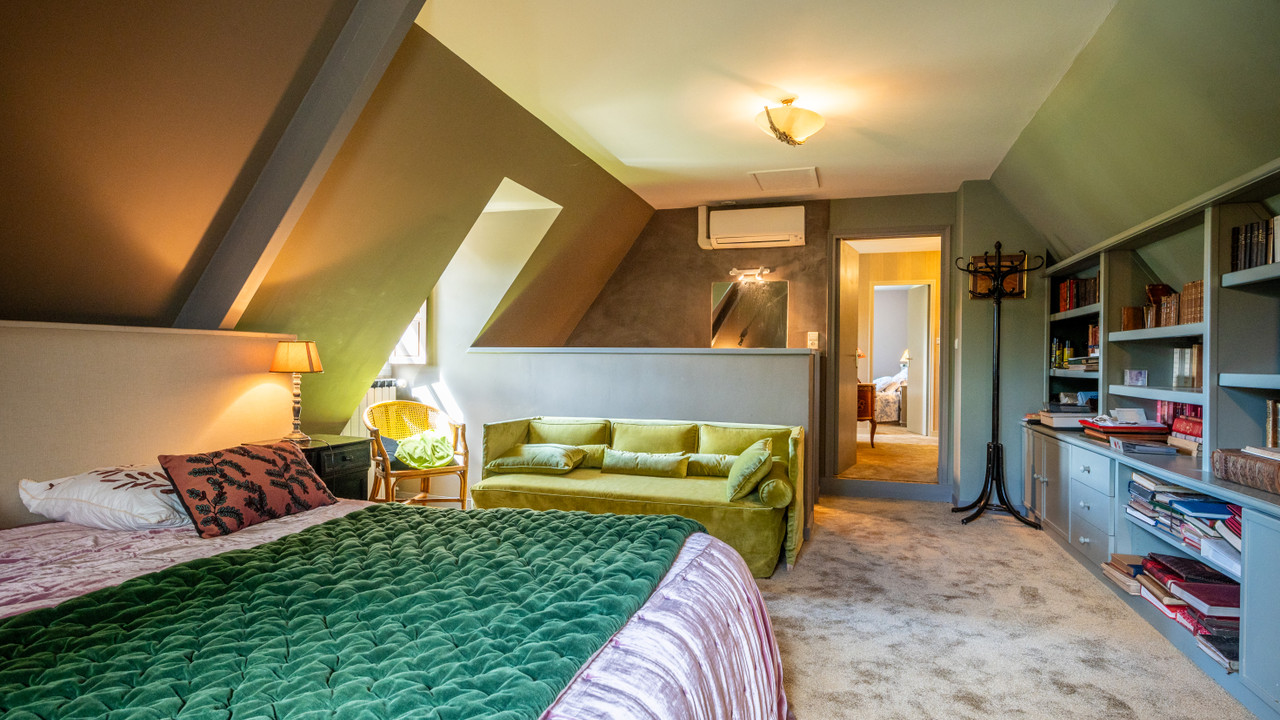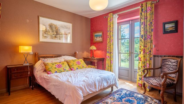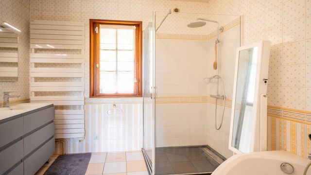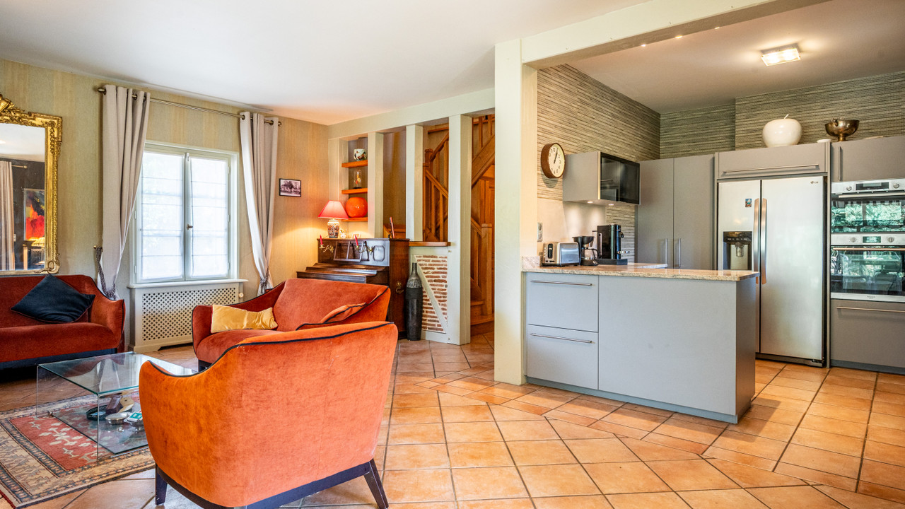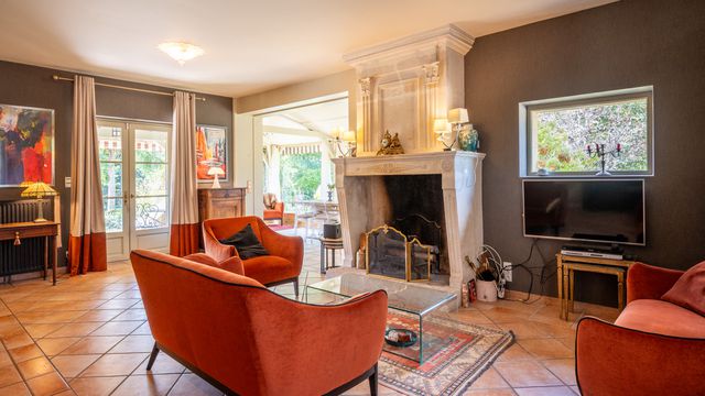 The wrought iron gate opens onto a landscaped driveway with parking and carport. The house has a total of five bedrooms and was built with high-quality materials (18th-century fireplace, textured wallpaper, fine wood doors, staircase, etc.) and the layout of the rooms offers a perfect coherence. The ground floor has a master bedroom and the first floor has three further bedrooms, one of which has an en-suite bathroom. A fifth bedroom with a shower room has independent access from the outside on the ground floor.