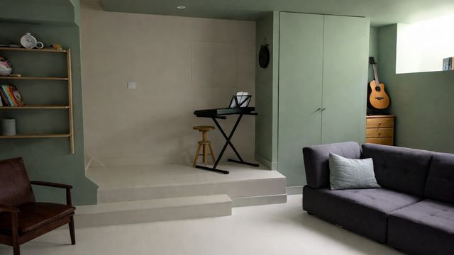 The ground floor comprises an entrance, a bedroom with shower room, a WC, and a spacious living area with open-plan kitchen. The first floor offers a bedroom, a bathroom and a utility room. The garden level includes two further bedrooms, one with dressing and en-suite, as well as a flexible office or playroom.