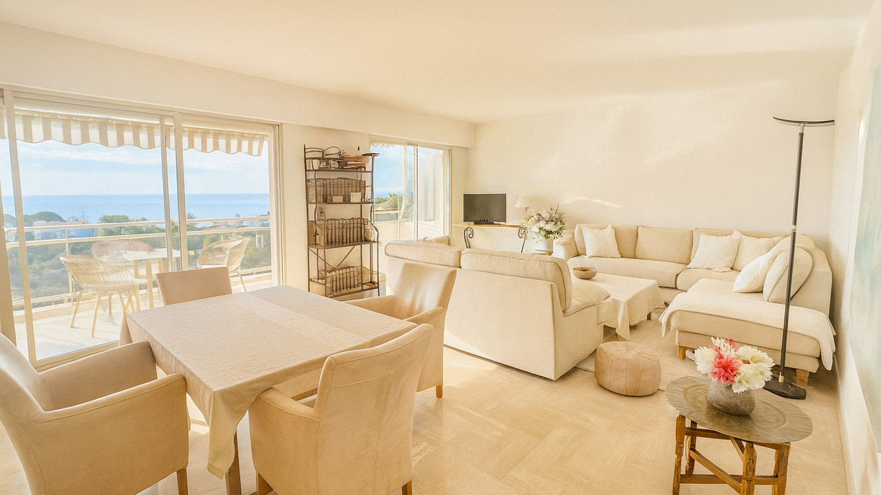 Live the dream of the South of France with this fully renovated, top-floor apartment offering breathtaking panoramic sea views over the Bay of Cannes and the Lérins Islands.