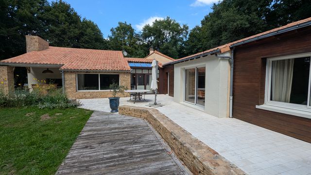 A40865MGO49 - This charming architect's house offers a perfect blend of modern amenities and tranquil living. The structure features high-quality materials and allows for single-storey living . The large entrance reveals various harmonious and convivial living spaces, including a cosy living room with a fireplace, and a dining room. The adjoining modern kitchen is both pleasant and functional. A mezzanine with office space, featuring a splendid chestnut ceiling, completes the warm atmosphere. The social areas of the property are bathed in natural light and enjoy views over the gardens and woodland. The bedrooms, each with their own shower room, and a large master suite with a dressing room and bathroom. The beautifully wooded park includes a covered and heated swimming pool near a large south-west facing terrace, offering a space for relaxation. Additional features include a double garage and other annex rooms