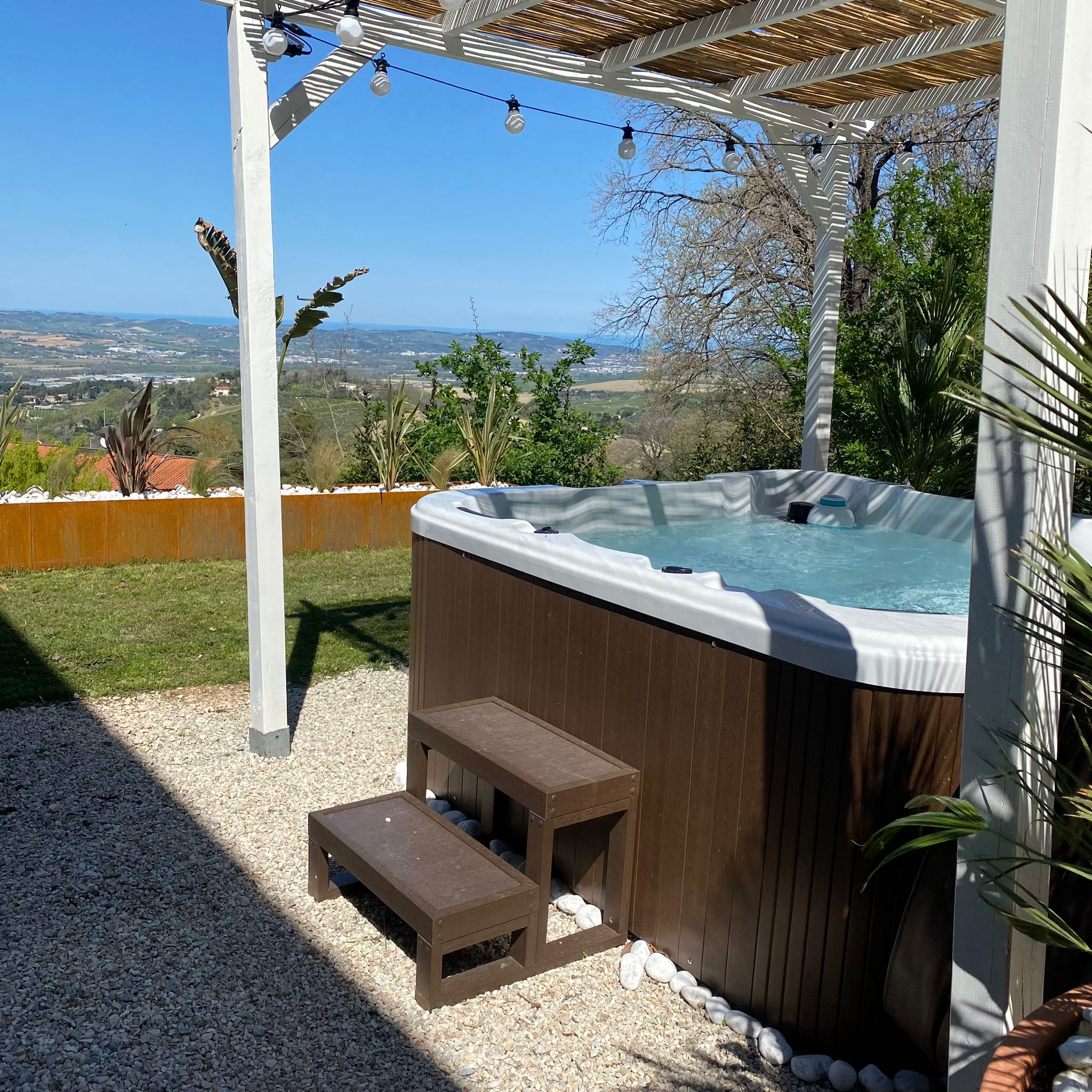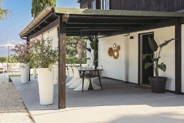 The house features a beautiful covered terrace (portico), which serves as an extension of the living room. It provides shade in summer, and with a pizza picked up from the local bakery, you can enjoy the sunset from the dining table under the portico.
