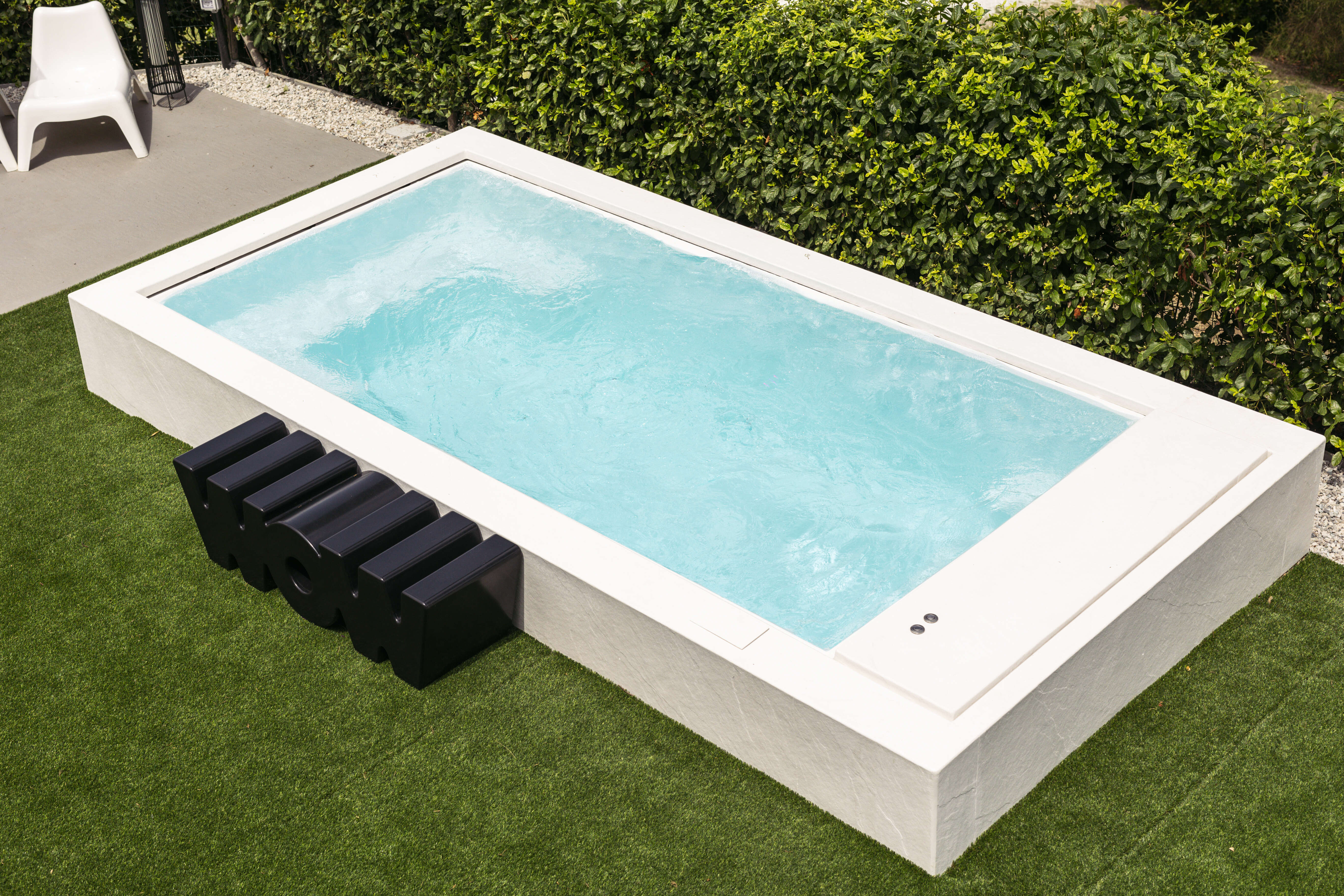 The garden has been designed to be relatively low-maintenance, with artificial grass and plants that require minimal care. The swimming pool is equipped with a jet stream for swimming against the current. For additional enjoyment in the spring and autumn seasons, there is a jacuzzi suitable for 5–7 people.