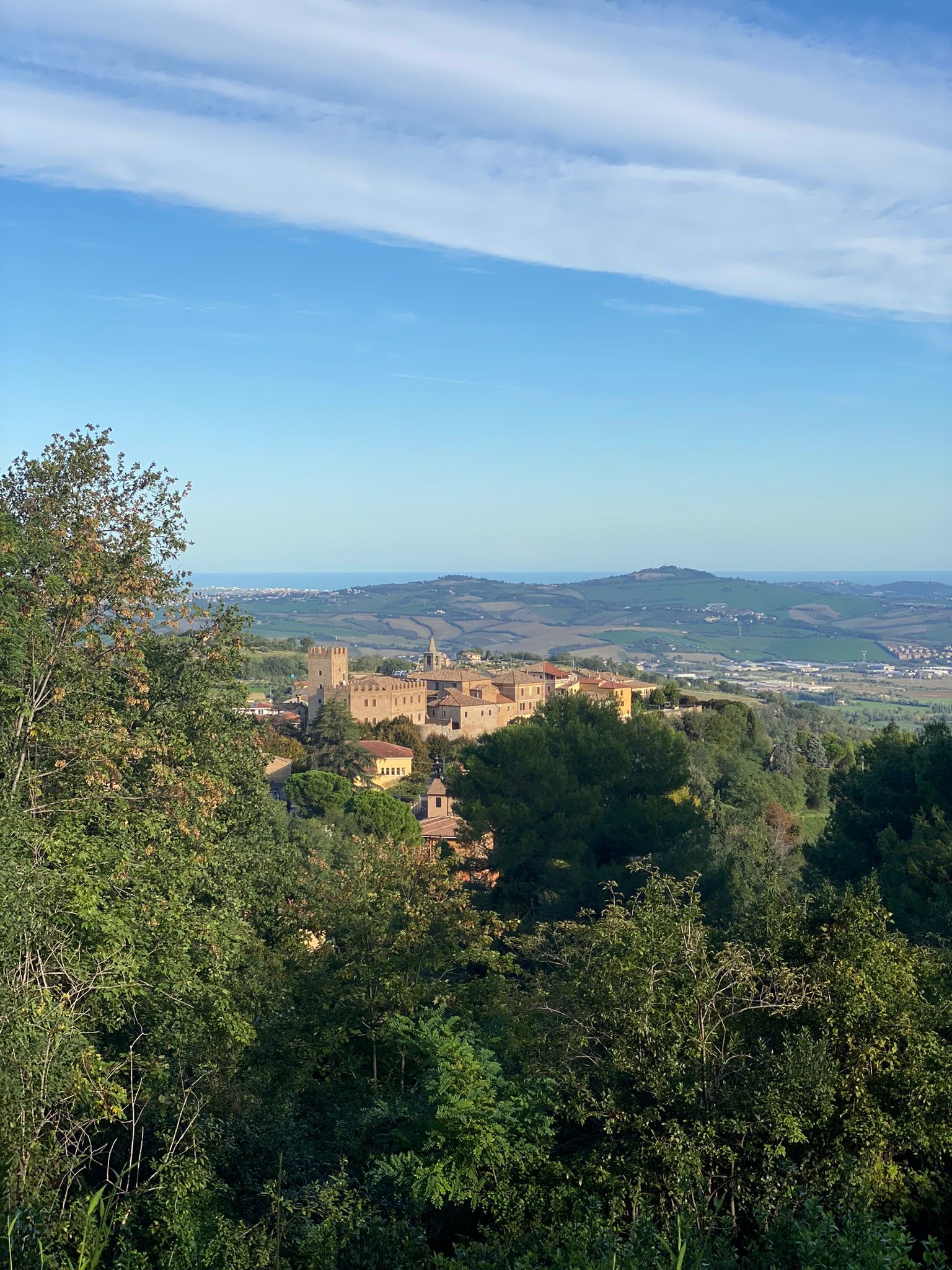 Just past the village, you drive slightly uphill where a large electric gate leads you to the property. Once you drive up the driveway, you are immediately greeted by breathtaking views stretching from San Marino to Pesaro — rolling hills with the sea in the background.