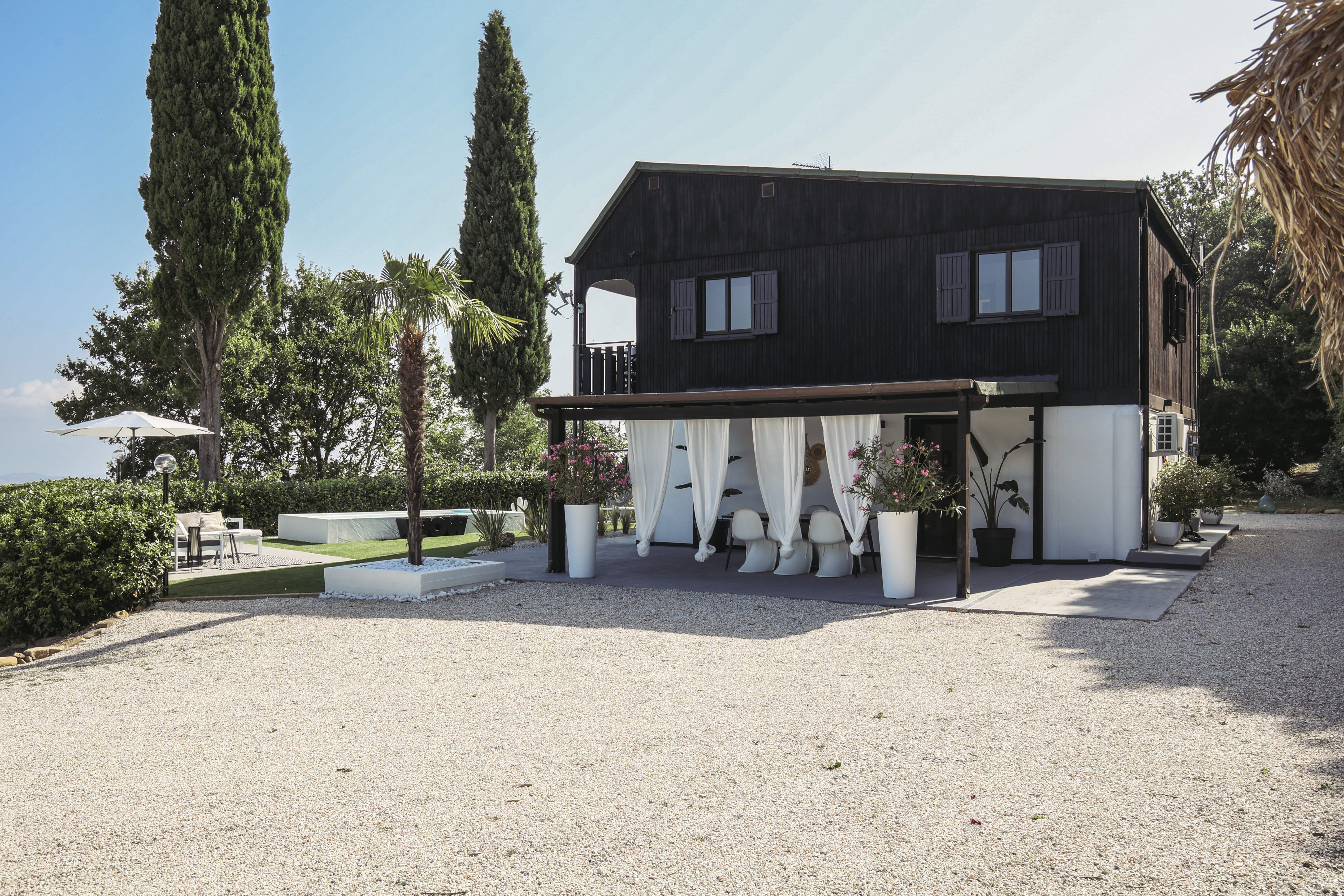 Just past the village, you drive slightly uphill where a large electric gate leads you to the property. Once you drive up the driveway, you are immediately greeted by breathtaking views stretching from San Marino to Pesaro — rolling hills with the sea in the background.