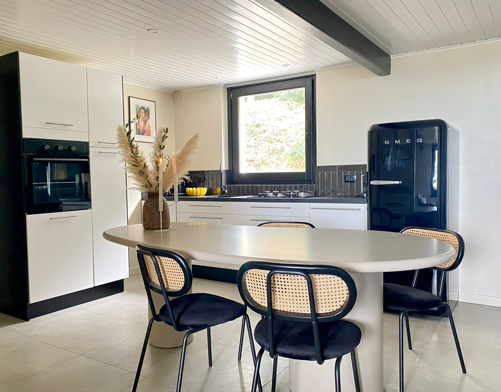 Living room with kitchen (equipped with, among other things, a dishwasher and SMEG refrigerator)