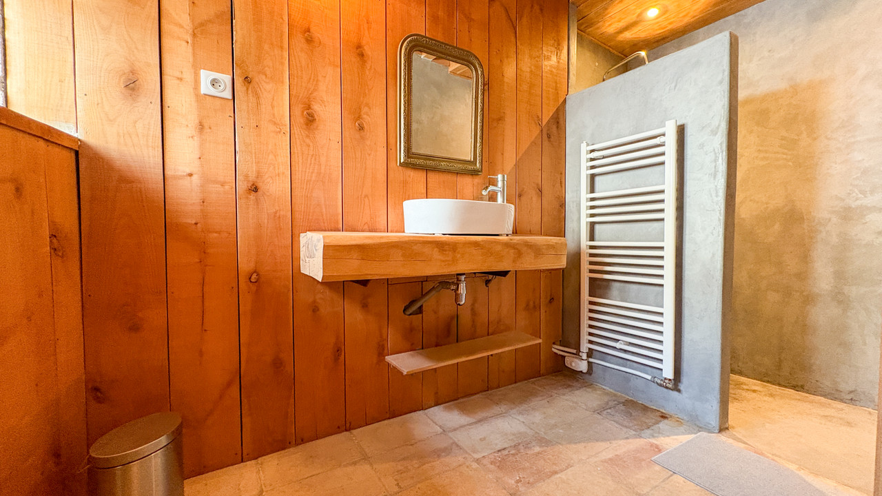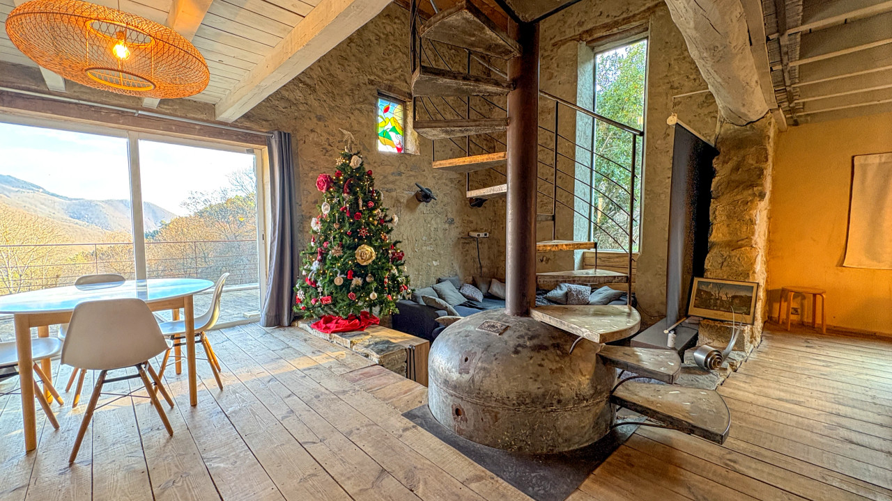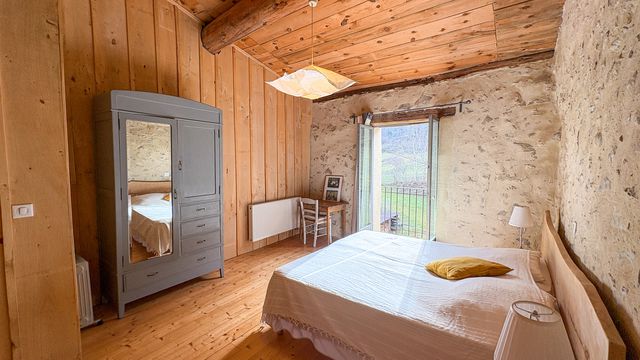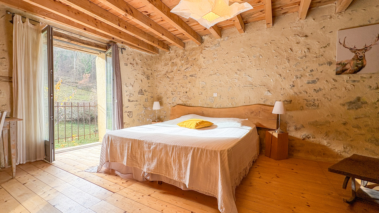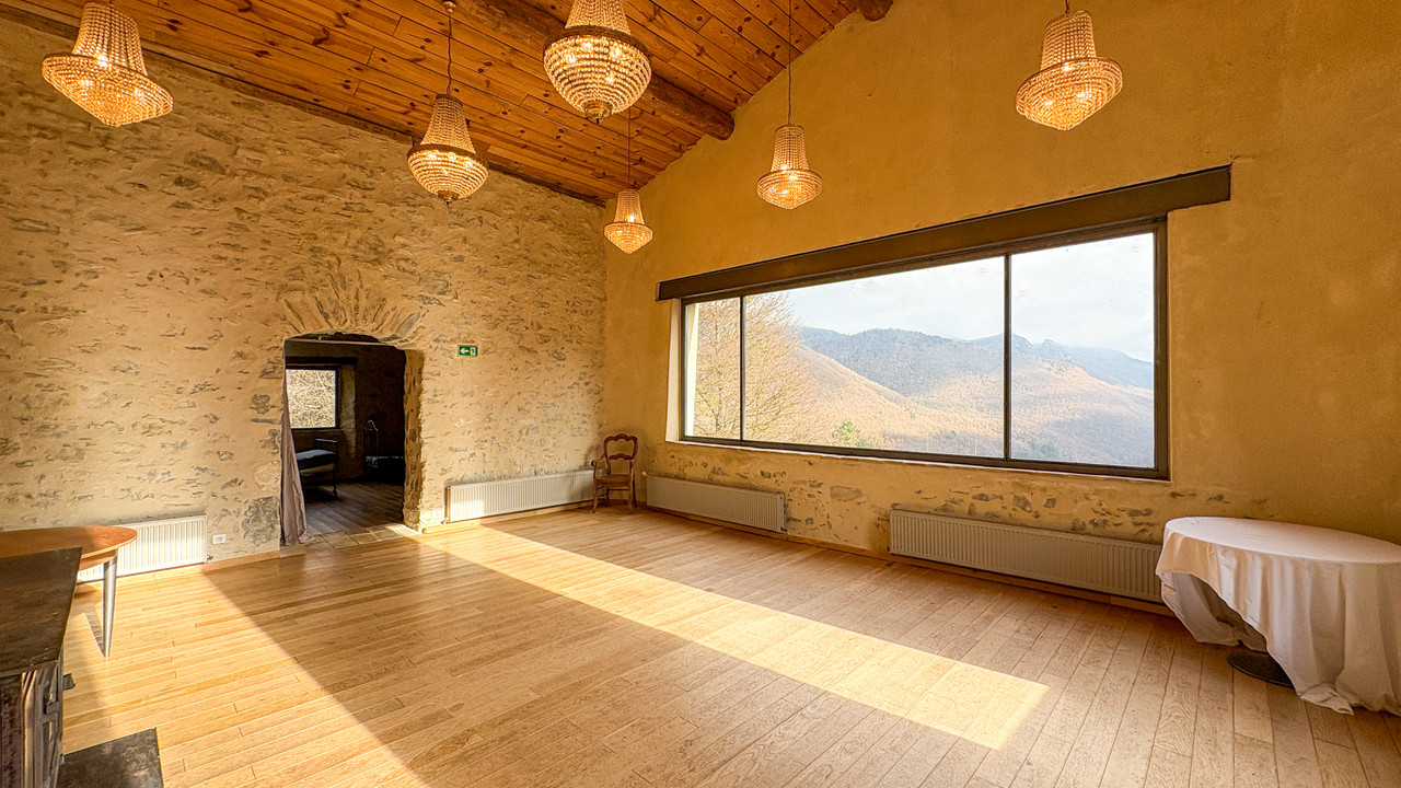 The fully renovated 110 m² main house includes 2 bedrooms, dressing room and office. The 320 m² tourism complex features 4 guest rooms (16 beds), a professional kitchen, reception room, shared living area and a heated pool. With solar panels, wood heating and spring water, near-total self-sufficiency is possible.