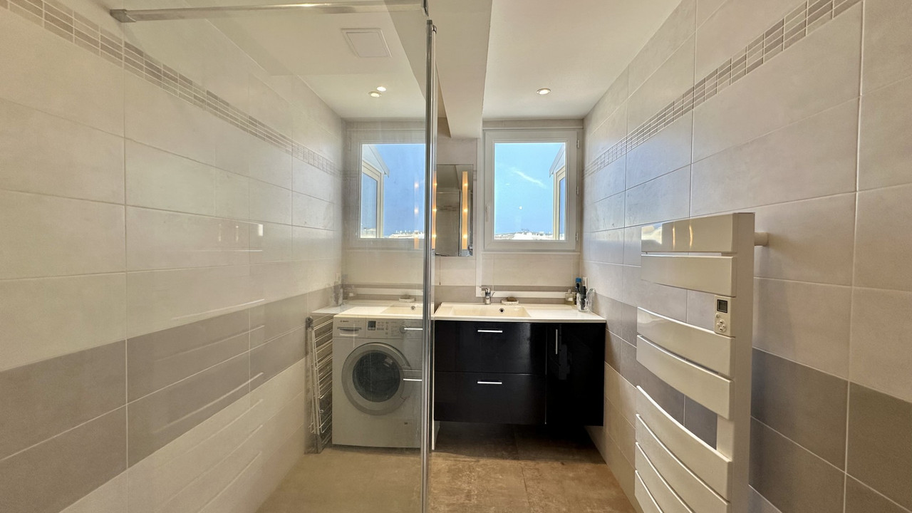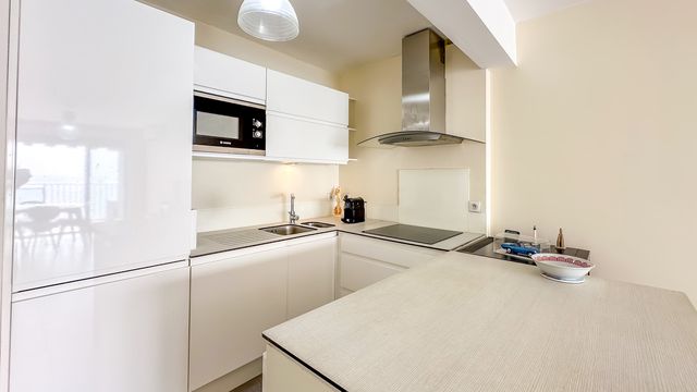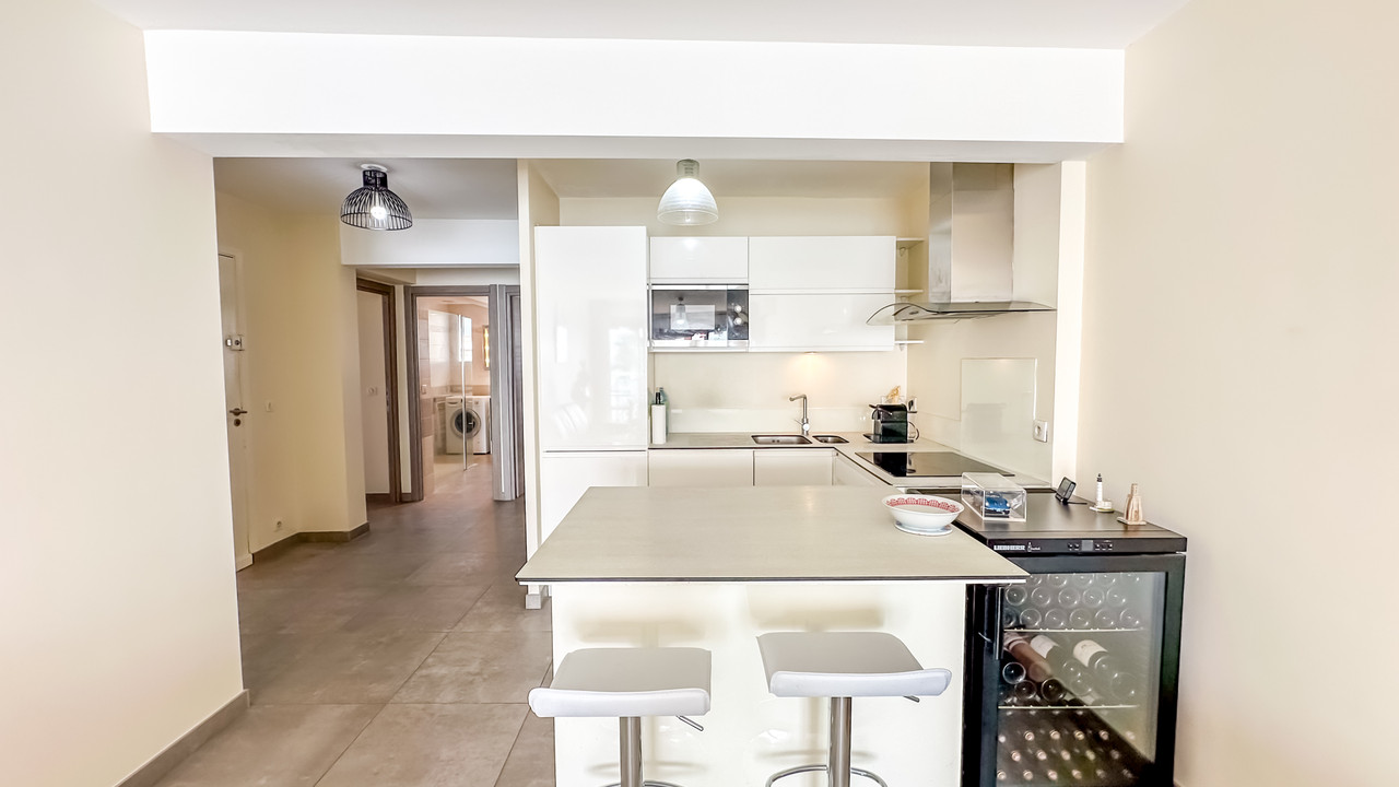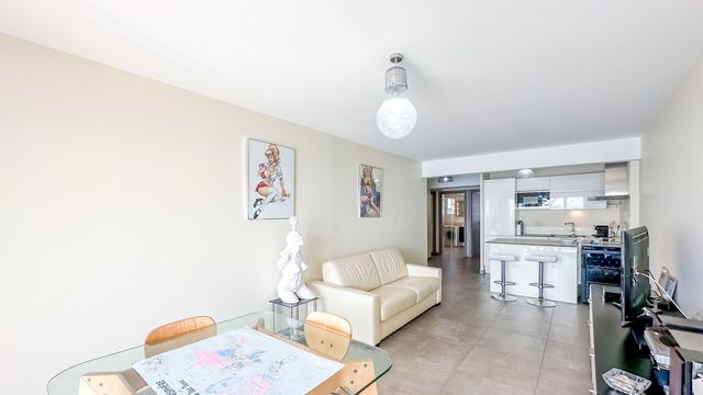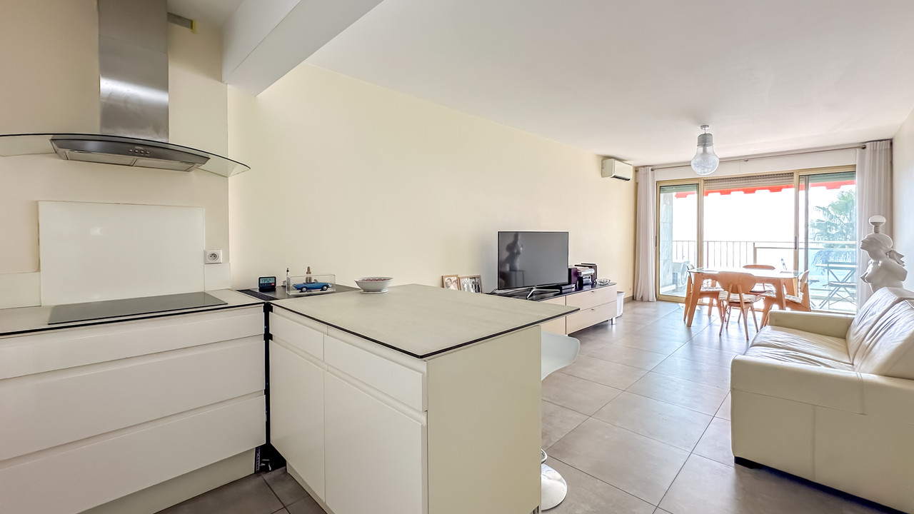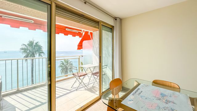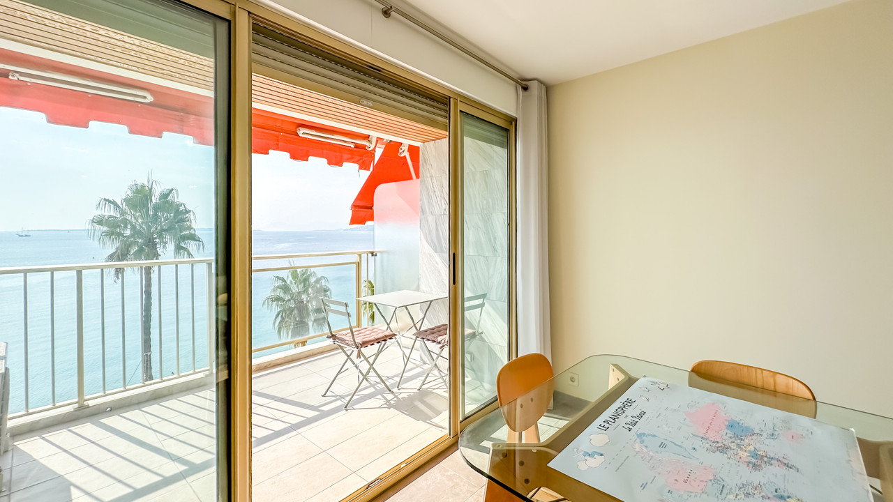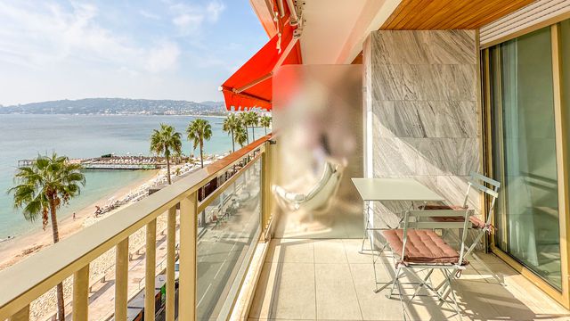 A40491PAK06 - Elegant and fully renovated 2-bedroom apartment of 75 m², located on the 6th floor with elevator. It offers a stunning panoramic sea view and direct access to the beach, within a sought-after residence in Antibes Juan-les-Pins and within walking distance of shops, restaurants, and public transport.
