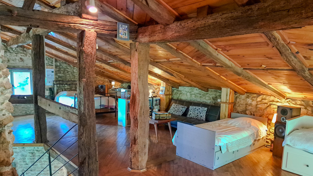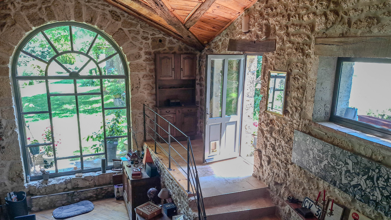 A29787SEF82 - In a peaceful and verdant setting, discover this character property. The main house of 170 m² blends old-world charm with modern comfort, featuring three bedrooms including two master suites, a bathroom with a laundry area, and a fully equipped kitchen. The spacious dining room of 40 m² opens onto a large conservatory and boasts a wood stove and a central fireplace with a double hearth. A 60 m² mezzanine overlooks the main room, offering versatile space. The 120 m² gîte, currently operational, includes a 20 m² living-dining room with an insert fireplace, a small mezzanine, a master suite, a troglodyte bedroom, another bedroom, and a fully equipped kitchen, with direct access to its own private pool. Enjoy over 2.5 hectares of land with a private forest, a dovecote, a barn, and a bread oven. Ideal for family or professional projects, this property offers an exceptional living environment with two private pools.