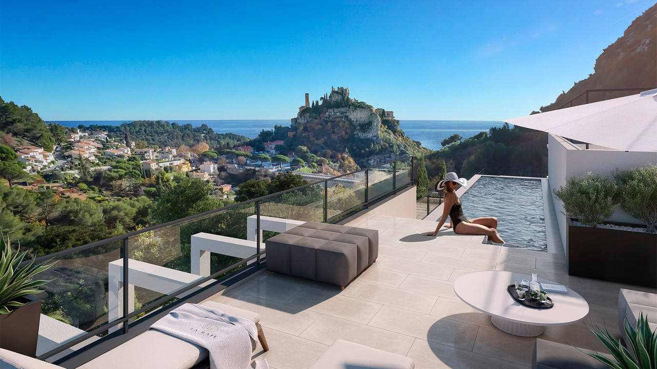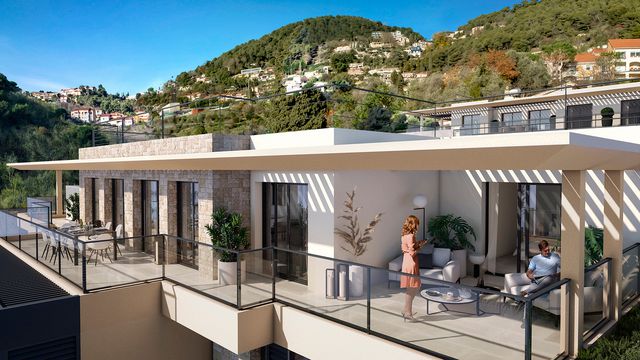 A25844OVI06 - Eze - New build. On the heights between Nice and Monaco, in an enchanting natural site, we are offering an exceptional development with a swimming pool. Mostly south-facing, the 22 apartments, from 2 to 5 rooms, have spectacular sea views. Spread over 2 buildings, they all have an outdoor space, private garden or terrace. A terraced landscaped garden follows the steep relief of the landscape.