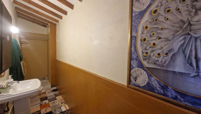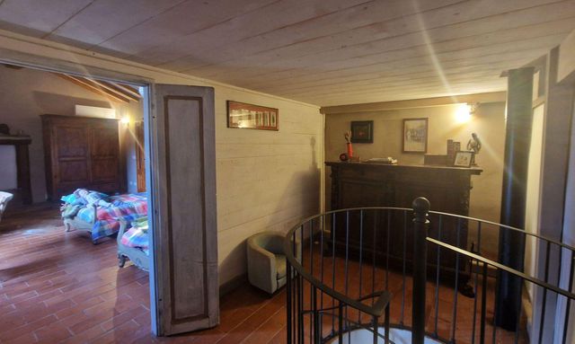 A spiral staircase leads to the first floor, where there are a hallway, a large room currently used as a bedroom and a further space in the attic, where a double bed is currently placed.