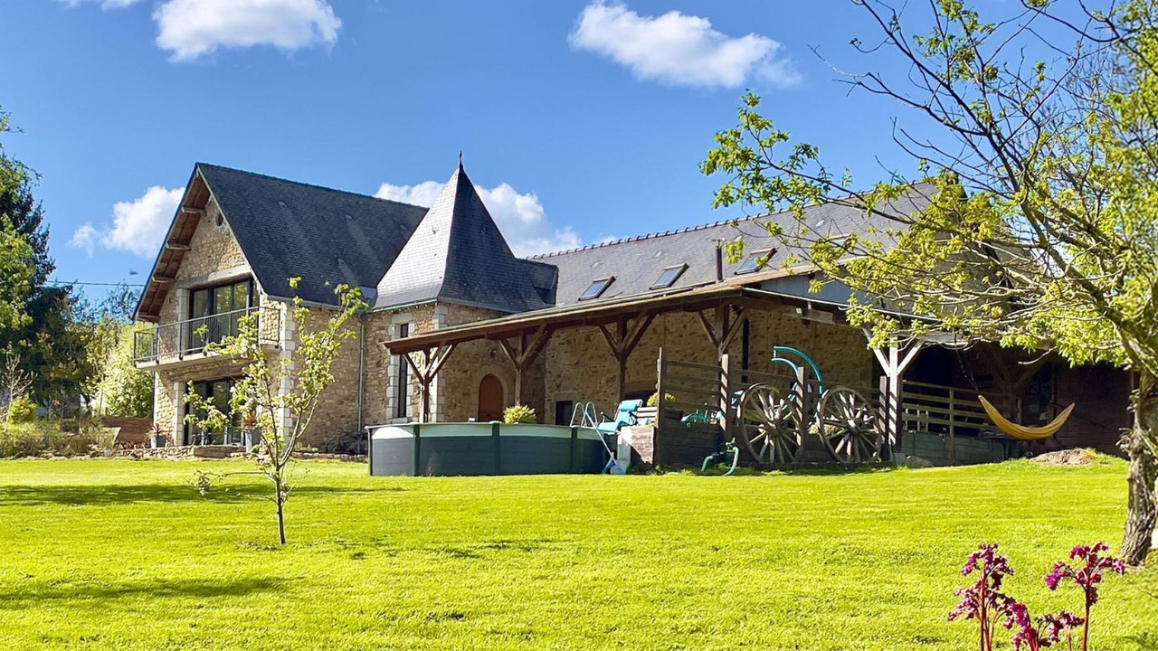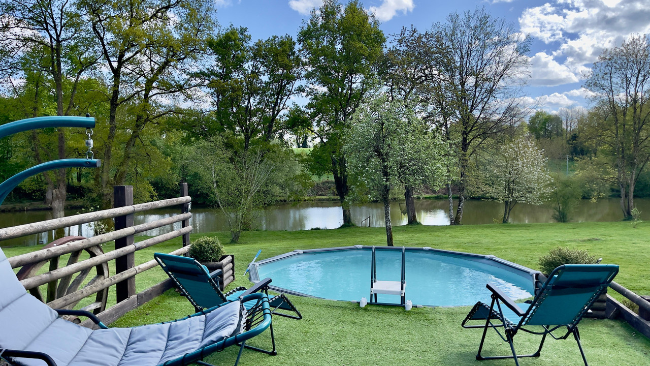 A36392SVM53 - Fully furnished 6-bed lakeside home with private spring-fed lake, terrace bar, pool and gated grounds near Hambers, Mayenne. Turnkey countryside living.