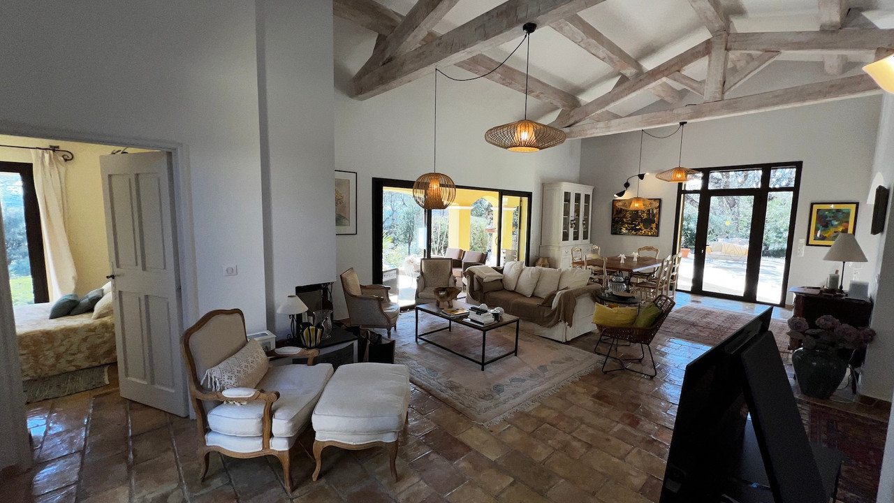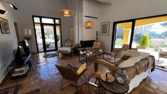 A39845GWI83 - Cotignac. Between the Gorges du Verdon and the Côte-d'Azur, Cotignac is certified most beautiful village of France since 2022. Close to the village and all amenities, lovely Provençal house set in the heart on superb plot more than 4 100 sqm, planted with Mediterranean trees. Privacy, quiet, it offers an open view on the surrounding countryside. Nice pool, summer kitchen with storage room, shower room and toilet. Entrance, spacious living / dining room with a chimney, this light room opens on a large terrace to the South-East, pretty open and fully equipped kitchen with dining space, laundry room, storage room, a spacious main bedroom, with cupboards, opening on a lovely patio, private shower room and toilet. Another bedroom with cupboards, private bathroom and toilet. On the other wing of the house two other bedrooms, 2 shower rooms and toilet. Carport, and parking