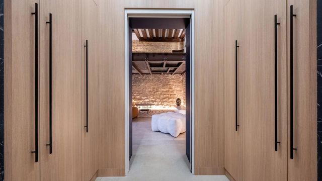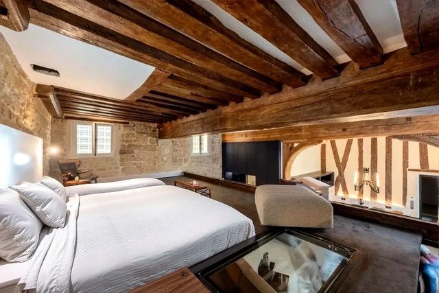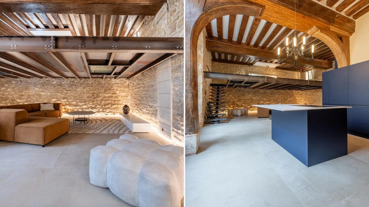 A41580HHE75 - In the heart of Île Saint‑Louis, set on a peaceful courtyard/garden, this ground‑floor loft‑style duplex of around 80 m² has been fully renovated. The main living space delivers a striking 4 m ceiling height, restored beams and stone, and an open, gallery‑like volume that feels airy and dramatic. A modern, designer kitchen with integrated appliances and clean lines anchors the space, perfect for everyday cooking and entertaining.