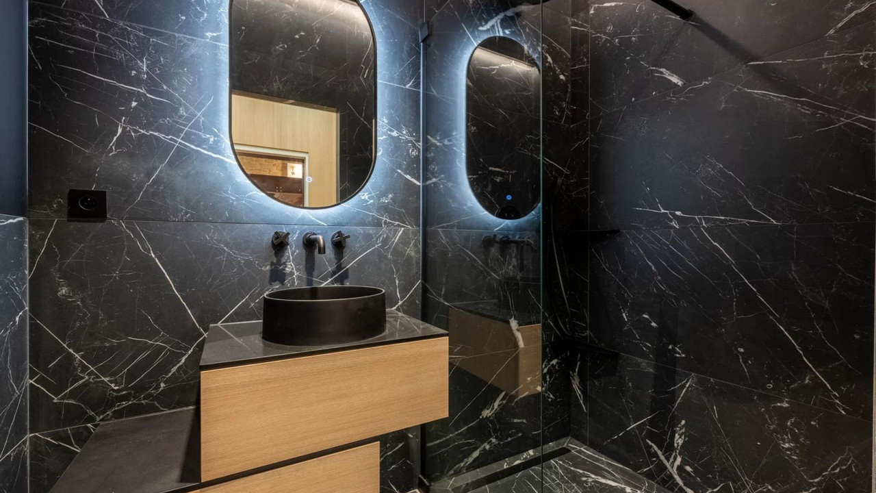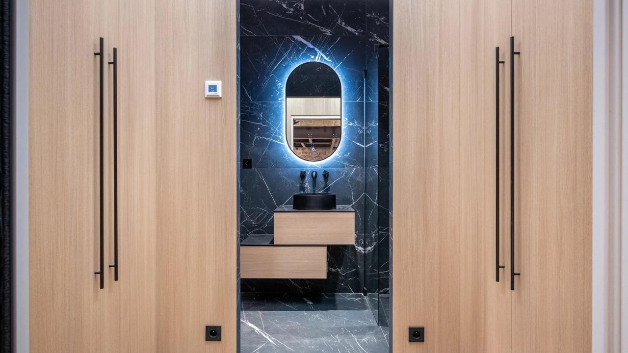 The mezzanine bedroom overlooks the reception area, creating a private yet connected suite. Finishes include bespoke storage, refined lighting, and a sleek contemporary bathroom for a polished, turnkey experience. Sold fully furnished.