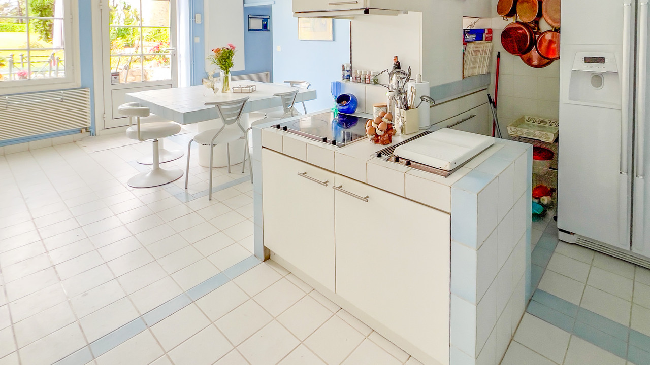 From here you can access the kitchen and the terrace. The spacious terrace is a favourite place to entertain and relax with its stone fireplace and views to the gardens and pool.